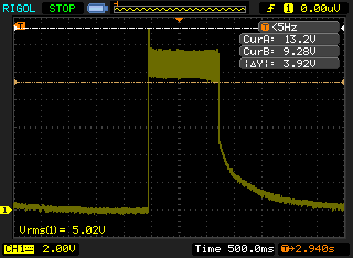 First scope shot shows 12V on DC coupling, second shot is a closer look at 12V ripple, third shot is 5V startup (fine.)