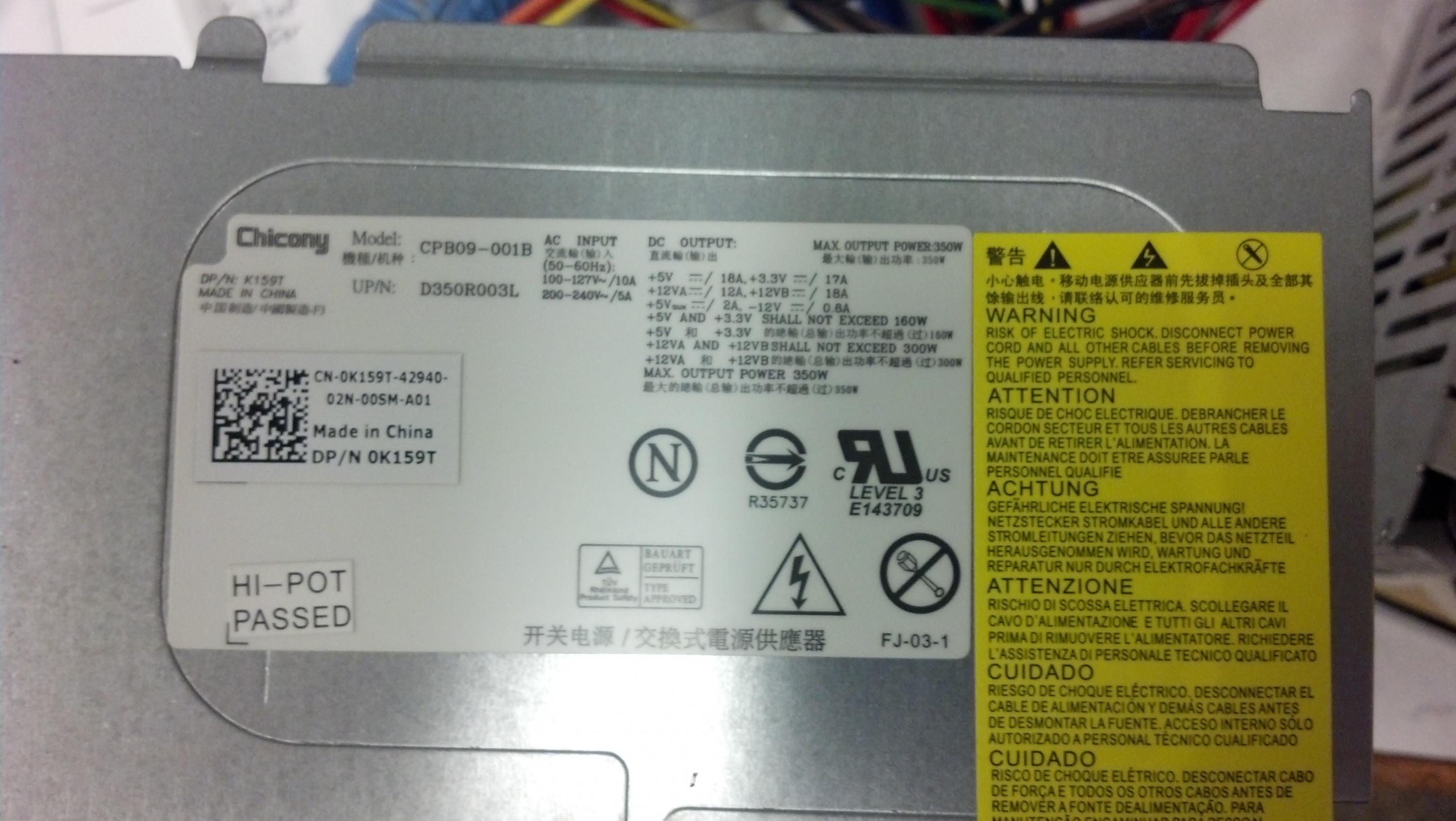 I wanted to share some pictures of power supply that came out of a PCI expansion box that was given too me. It is one of the heaviest and dense power supplies I have yet encountered. It also has three heatsinks compared to the standard two found in most supplies. It does not have the best brands of capacitors but I did not see any of them bulging and it had been running 24/7 for >7 years if not longer.