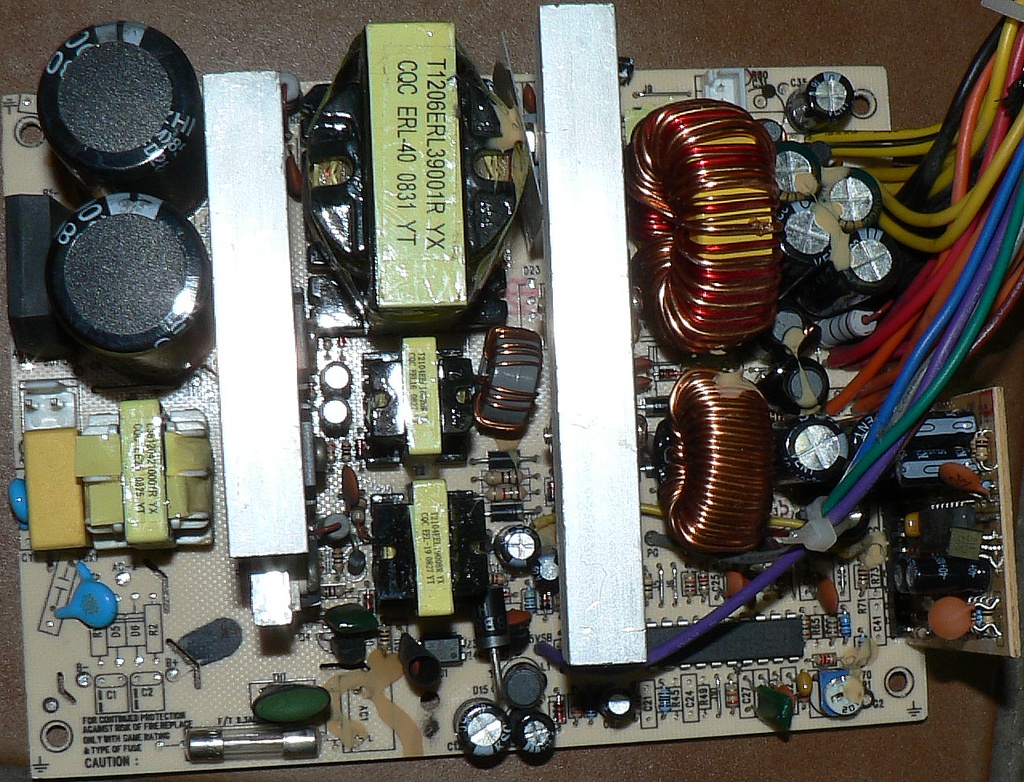 It lacks only varistors on input. ZHN caps pretending to be 680 uF, can't really measure, no meter. Passive PFC and KBU 606. Fairchild's 13009 switchers with 02N60P for +5 V SB.