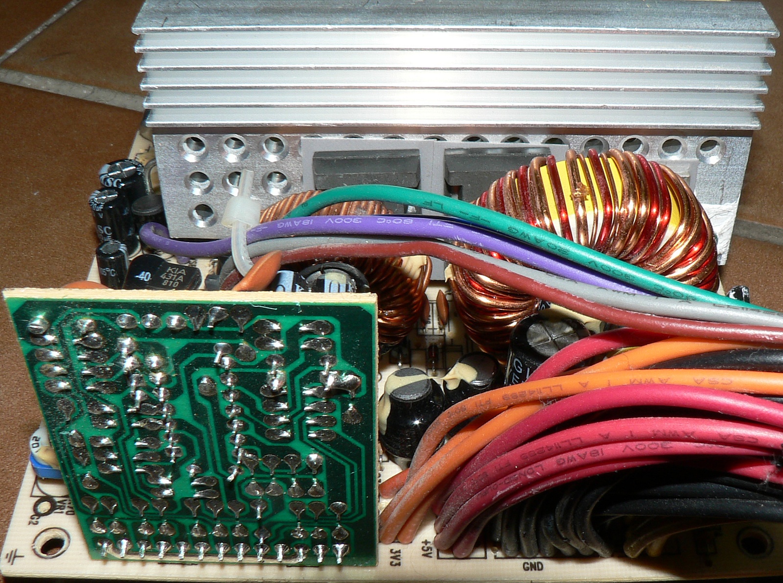 You can see beefy coils on output as well as KSC and Teapo caps; 3300 uF/10 V and 2200 uF/16 V. Can't measure them but visibly OK considering some 5-6 years of use with Venice Athlon 64 3200+ and passive GT 7600. Cables used mostly 20AWG.