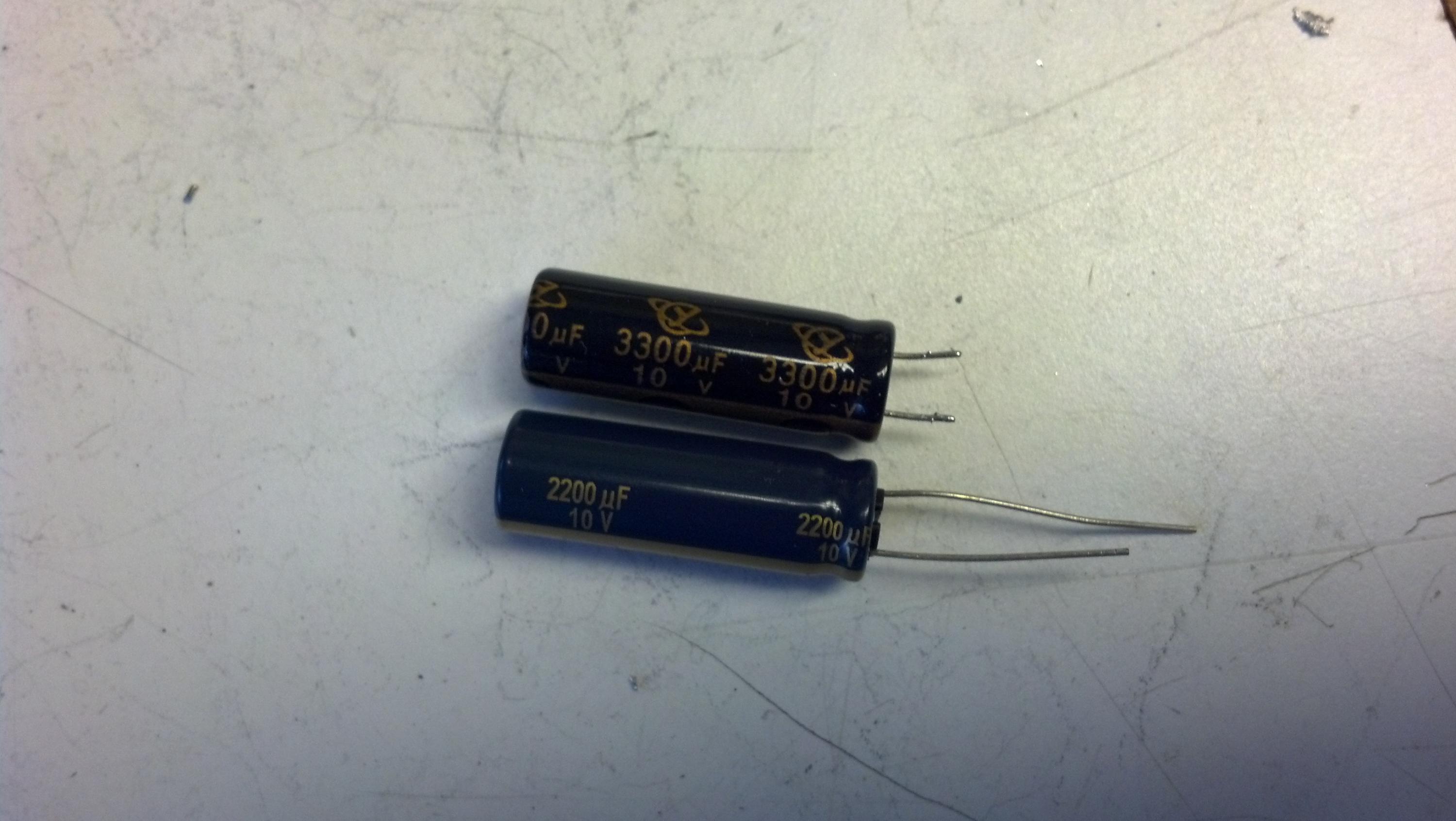 I can't find the datasheets and I don't have 3300uF 10V caps in this size that will fit under that secondary heatsink. You think this Panny cap matches ripple? They're the same dimensions