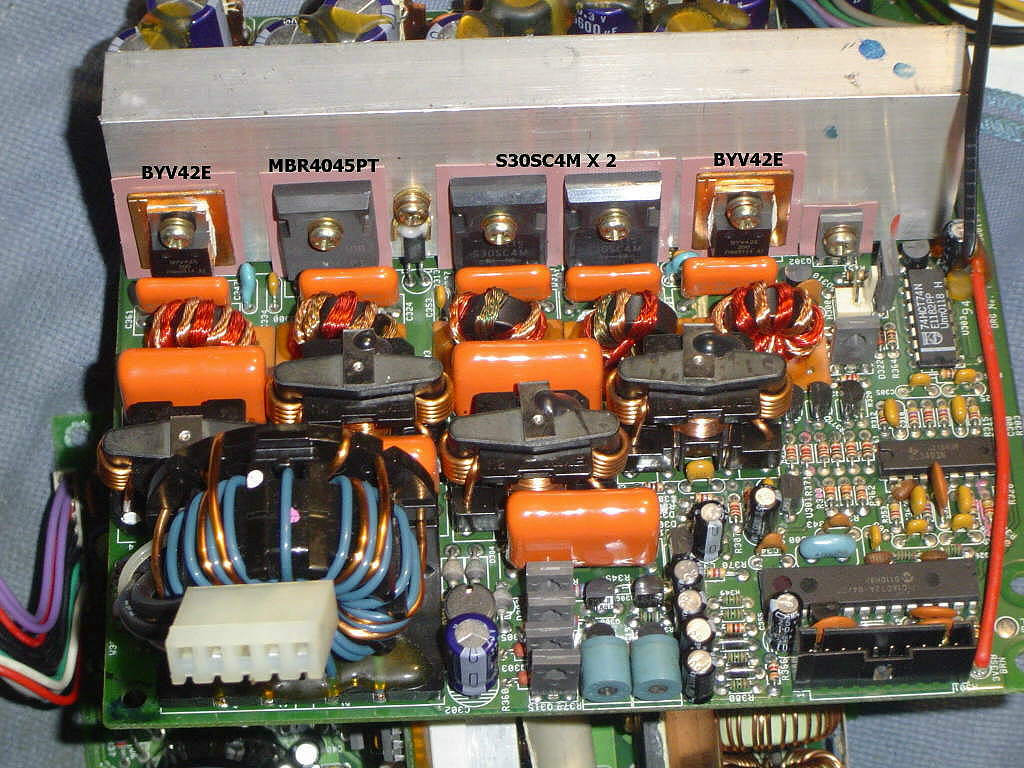 And here we have the 5v rectifiers. I know these three are for the 5v, and there are others that may or may not be, I can't tell without taking the board out. They are rated for 30A each, so that's a total of 120A on the 5v line (but maybe more), and the rail is rated at 34A. Overkill much? Jeez! Caps are 4x NCC LXJ 3300uF @ 10v.