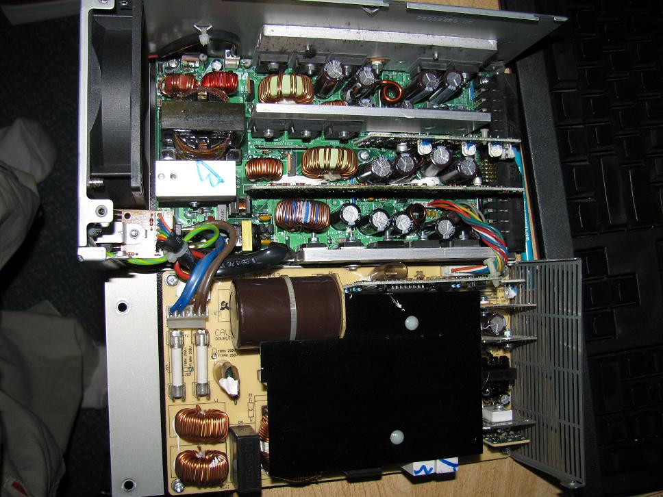 After quite a bit of fiddling, I was able to get it apart. Here's an overall shot of the inside. Under the black sheet is a gigantic heatsink....I believe it's for the APFC circuitry. The primary filter cap is a huge NCC 470uF @ 450V monster.