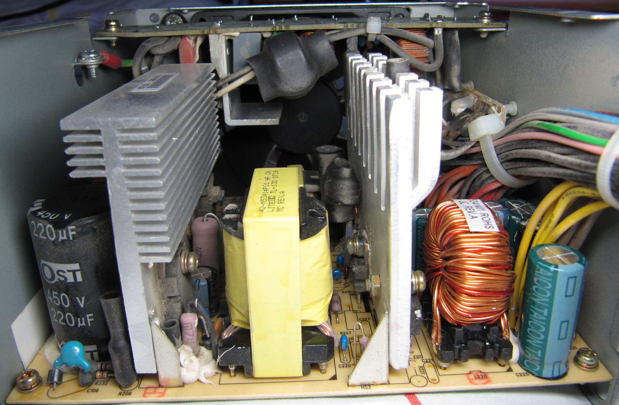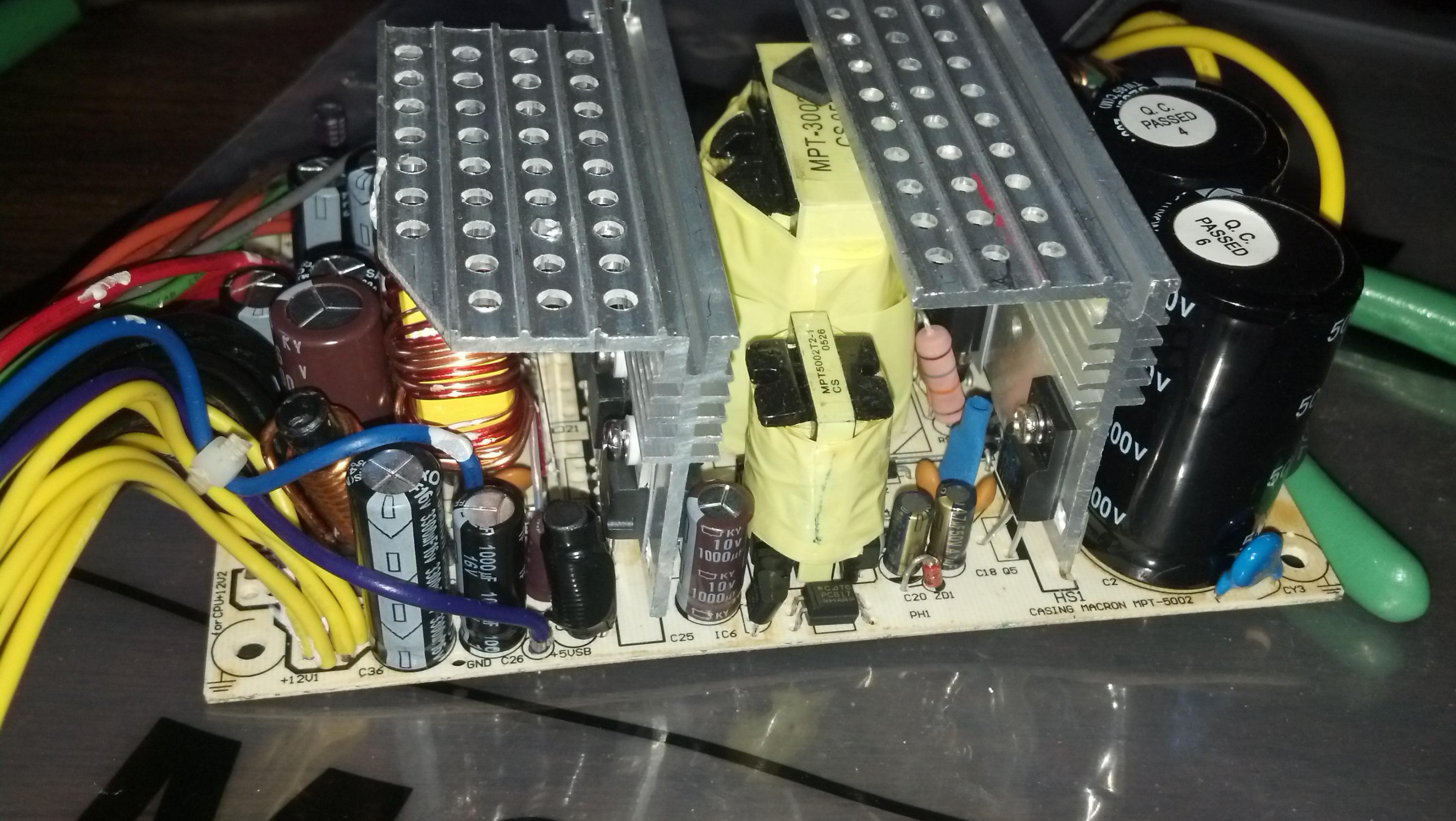 My friend said he'd give me $40 for a reliable 300W PSU, so I grabbed this Pixxo out of the bin at work and recapped it. Can't figure out the OEM. It had Asia X capacitors, replaced them with good parts but I used 680uF Fhy on the primary. Sorry I didn't snap a pic but this PSU implements the Viper22A. I think this will work well for him. Double forward with 14A FET's, 30A on the minor rails and what looks like two 12V rails with OCP, each schottky at 20A. has a really quiet fan. Also, I added that wimpy heatsink to the bridge rectifier, just because it was lying around