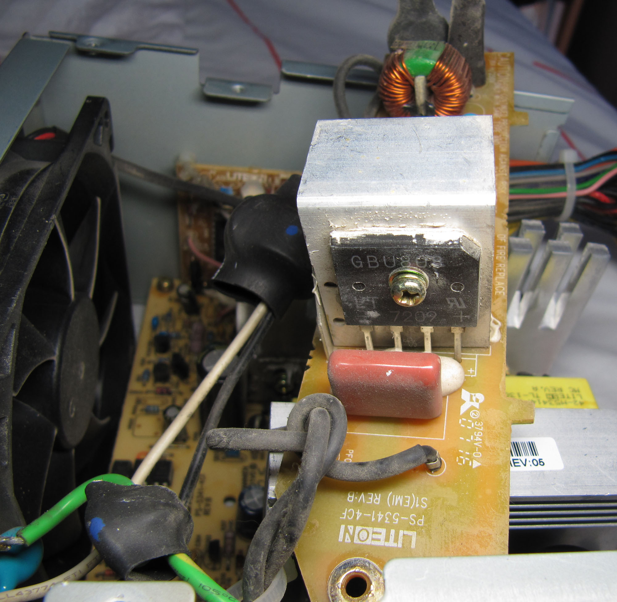 My friend said he'd give me $40 for a reliable 300W PSU, so I grabbed this Pixxo out of the bin at work and recapped it. Can't figure out the OEM. It had Asia X capacitors, replaced them with good parts but I used 680uF Fhy on the primary. Sorry I didn't snap a pic but this PSU implements the Viper22A. I think this will work well for him. Double forward with 14A FET's, 30A on the minor rails and what looks like two 12V rails with OCP, each schottky at 20A. has a really quiet fan. Also, I added that wimpy heatsink to the bridge rectifier, just because it was lying around