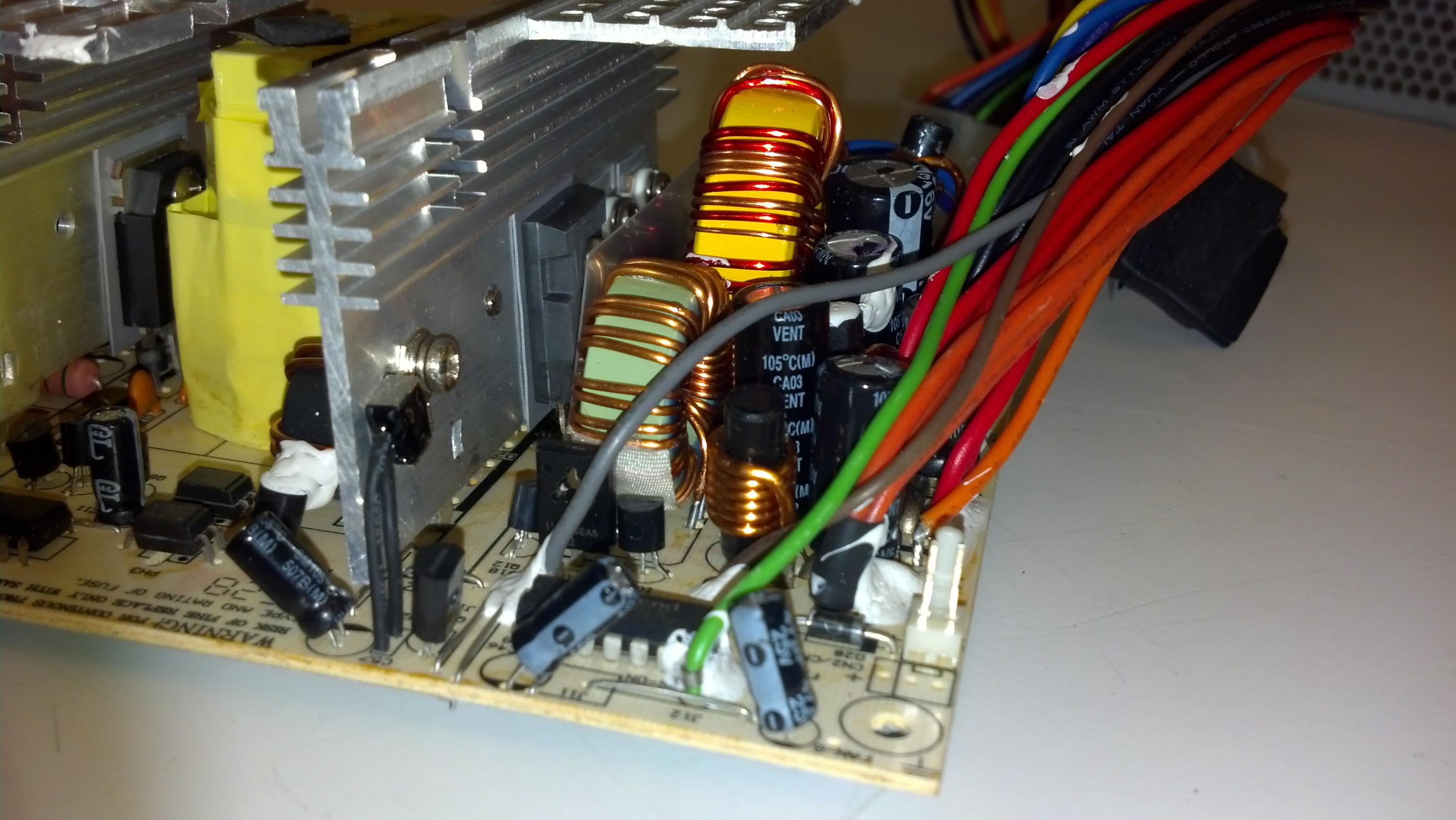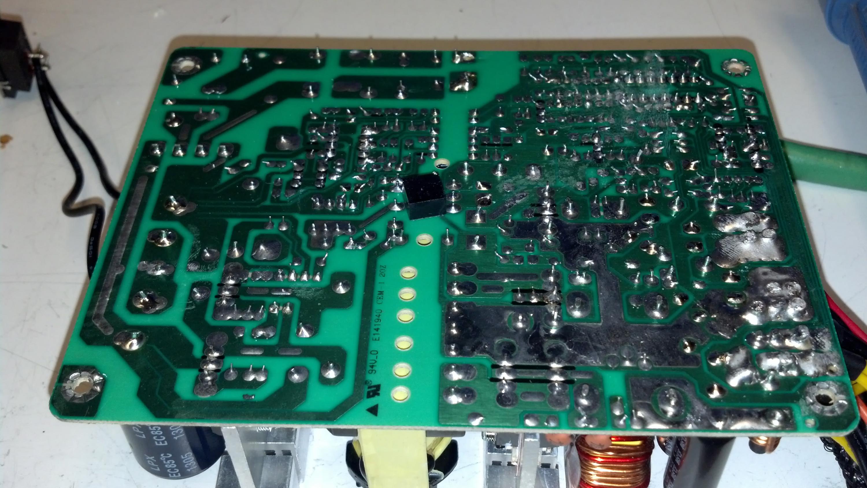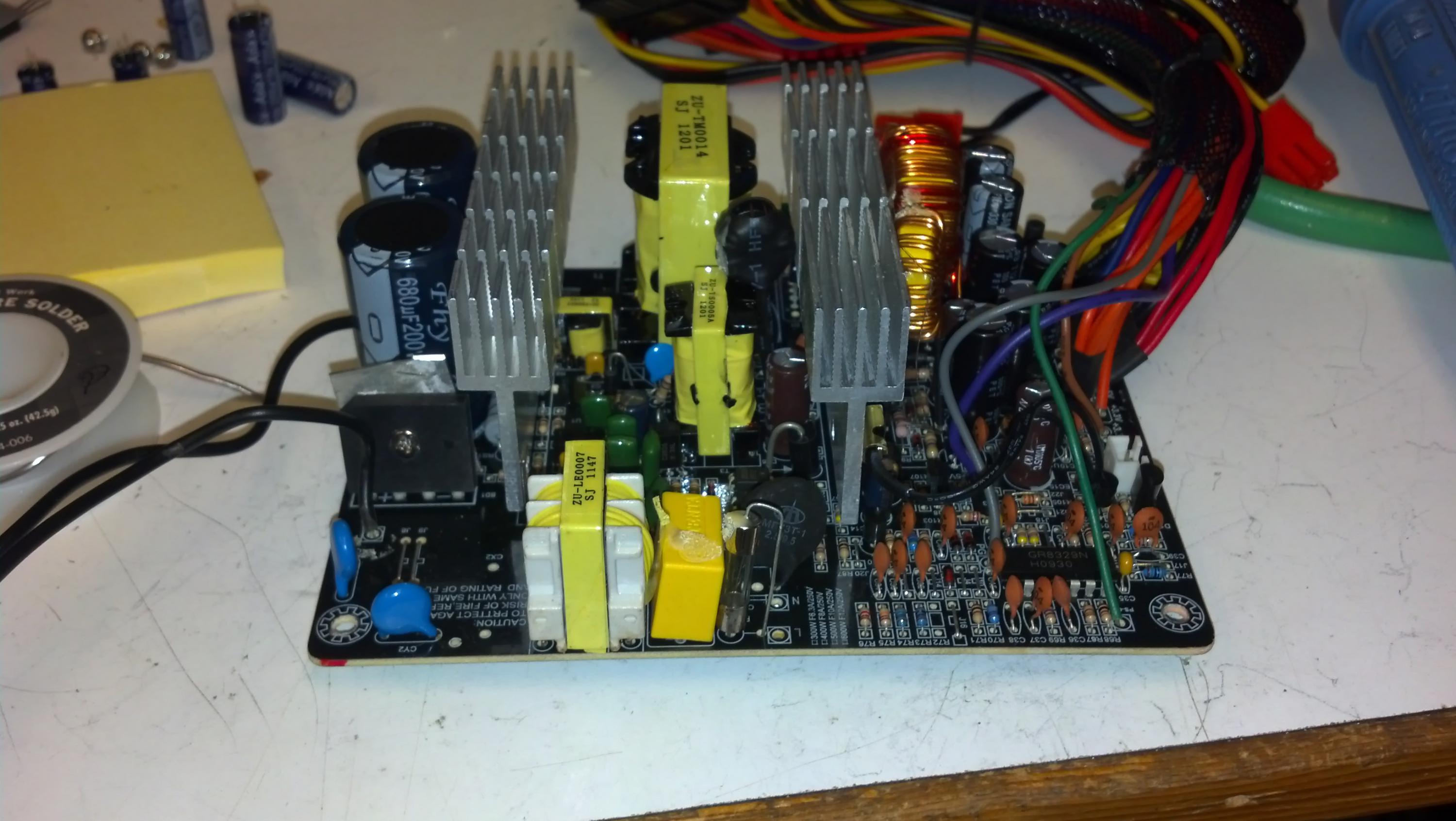 My friend said he'd give me $40 for a reliable 300W PSU, so I grabbed this Pixxo out of the bin at work and recapped it. Can't figure out the OEM. It had Asia X capacitors, replaced them with good parts but I used 680uF Fhy on the primary. Sorry I didn't snap a pic but this PSU implements the Viper22A. I think this will work well for him. Double forward with 14A FET's, 30A on the minor rails and what looks like two 12V rails with OCP, each schottky at 20A. has a really quiet fan. Also, I added that wimpy heatsink to the bridge rectifier, just because it was lying around