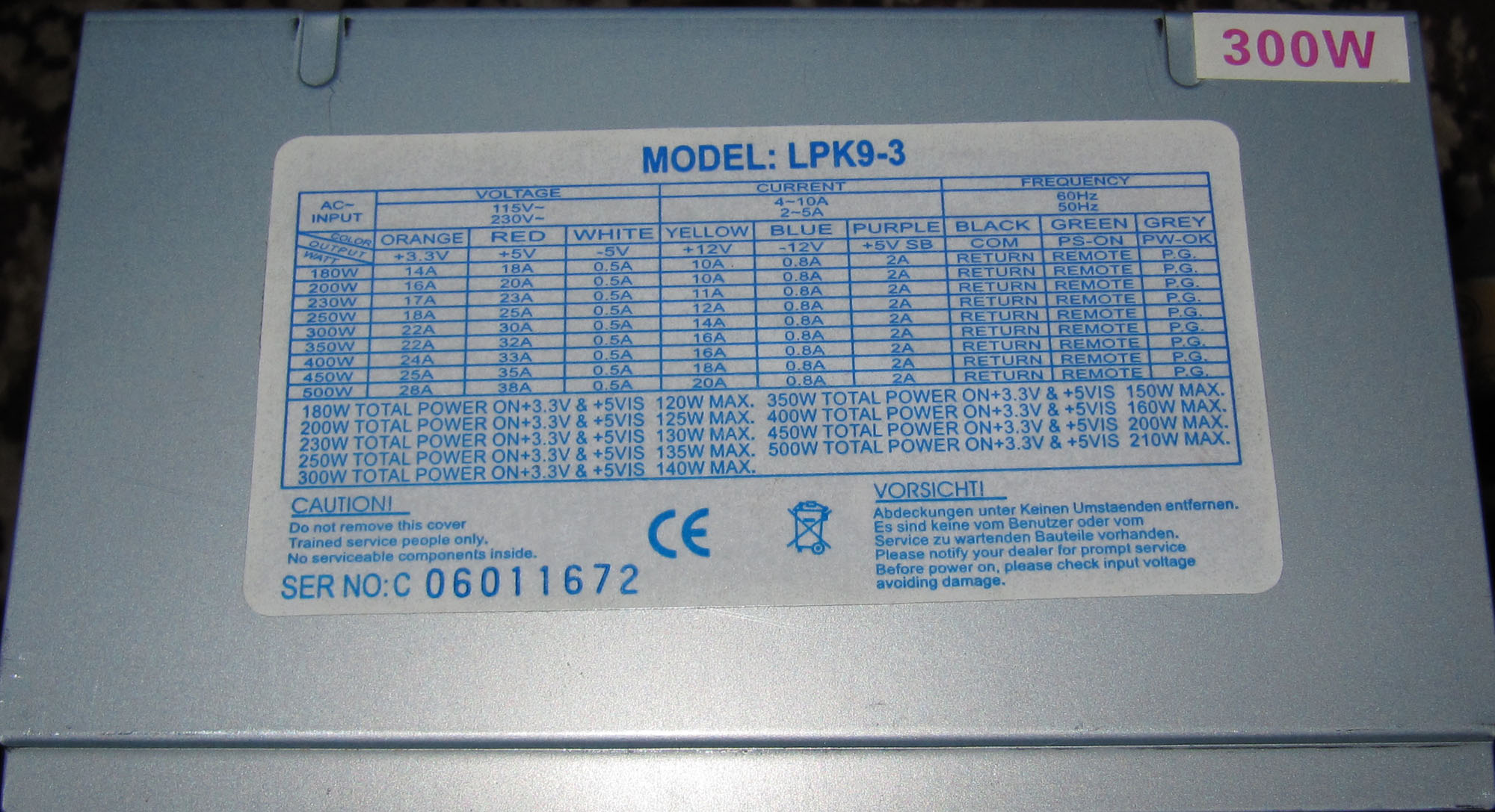 Every cap on that thing is Japanese. It is ridiculously overbuilt, 12V and 5V have 30A schottky rectifiers, 3.3V has 2x2200uF 10V KZE, 5V output caps are 1x4700uF 10V KZE & 1x2200uF 10V KZE and 12V has 1x2200uF 16V KZE & 1x1000uF 16V.