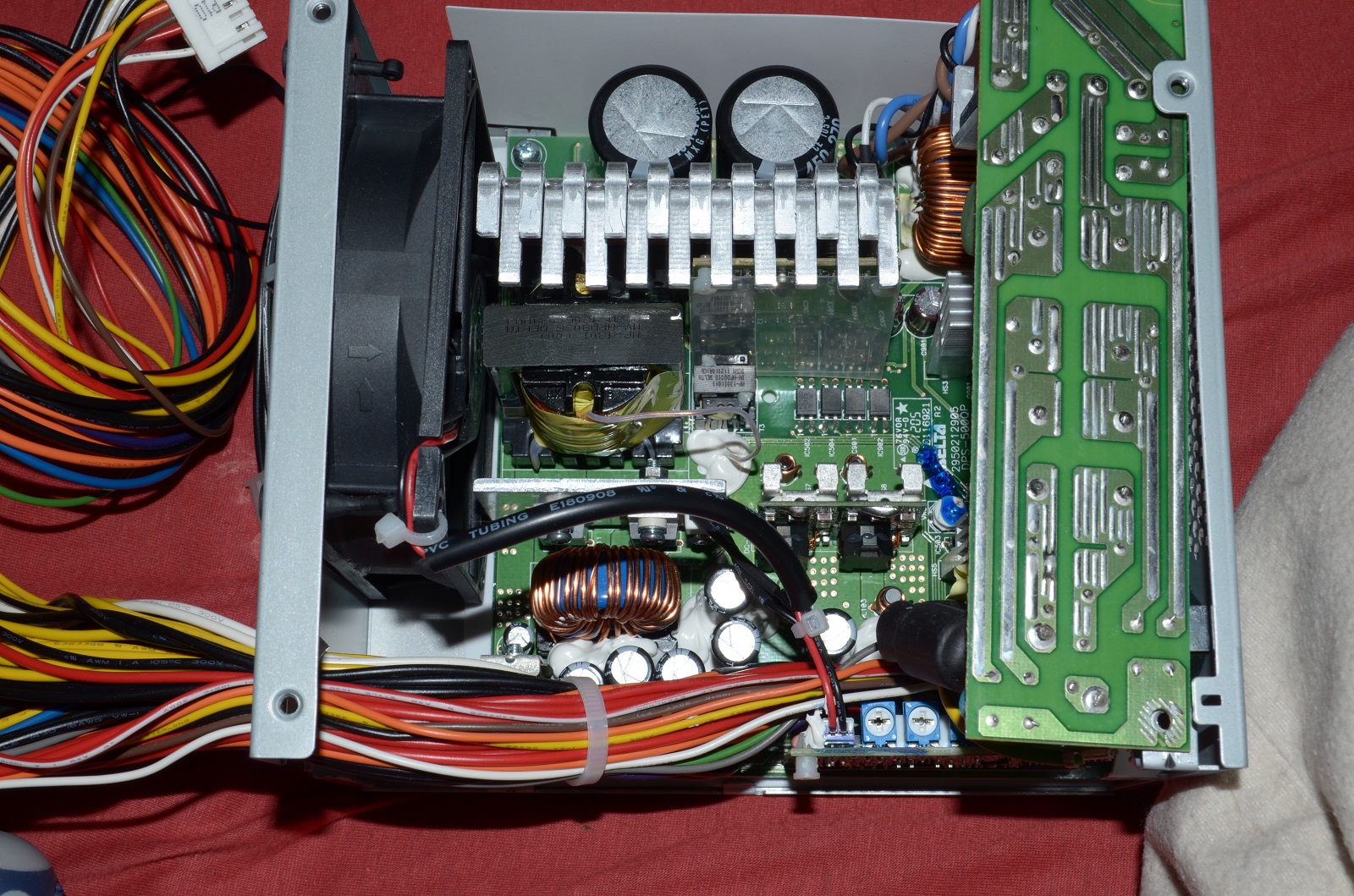 I recapped this Sun Pro (branded Winsis, posted a while ago) Pretty decent PSU now. Those CS caps measured ~810uF. I added MOV's, and relocated the fan control thermistor. It was in the 3.3V toroid coil, so I moved it to the main toroid. Fan still spins really slow, but it's nice and silent. It's in my main file server now which is Intel D946GZIS (All nichicon caps), Celeron D 3.46GHz Cedar Mill, 3GB DDR2, gigabit Pcie x1 card, two 2TB Seagate drives in RAID 1 via adaptec 1430SA.
