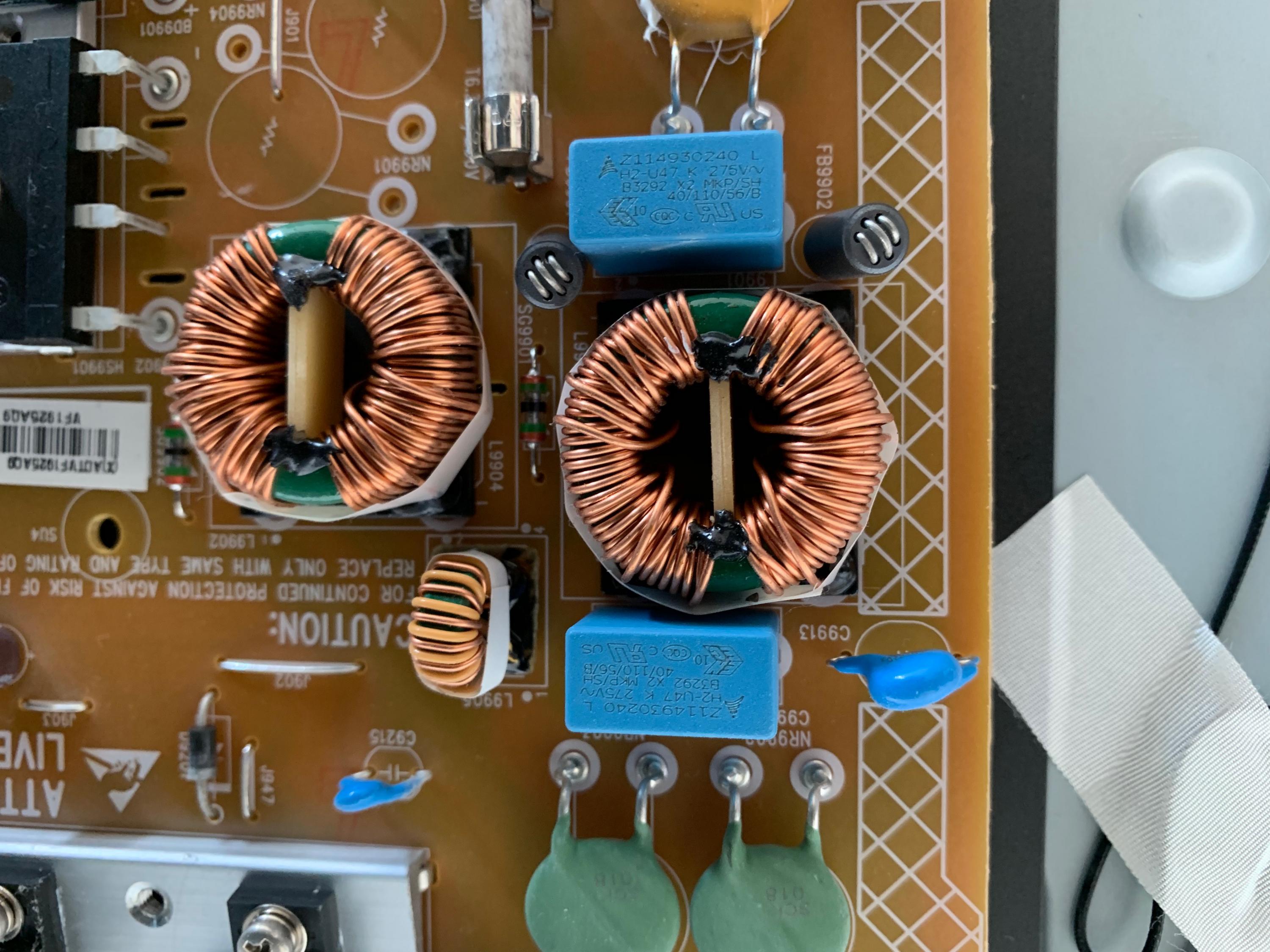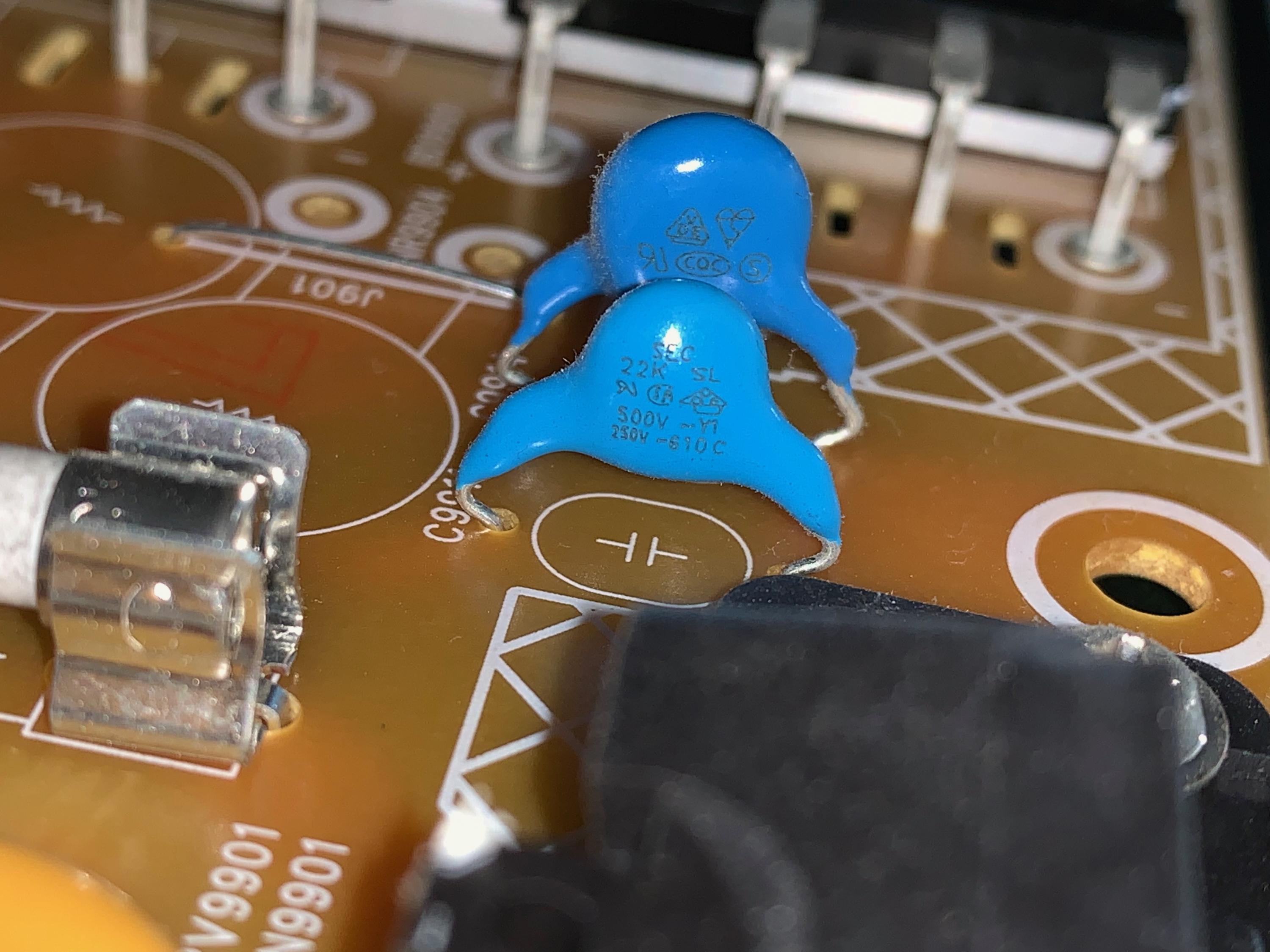 Check the voltage rating on the blue caps C9901, C9902, I checked the mov (RV9901) and it will be ok.