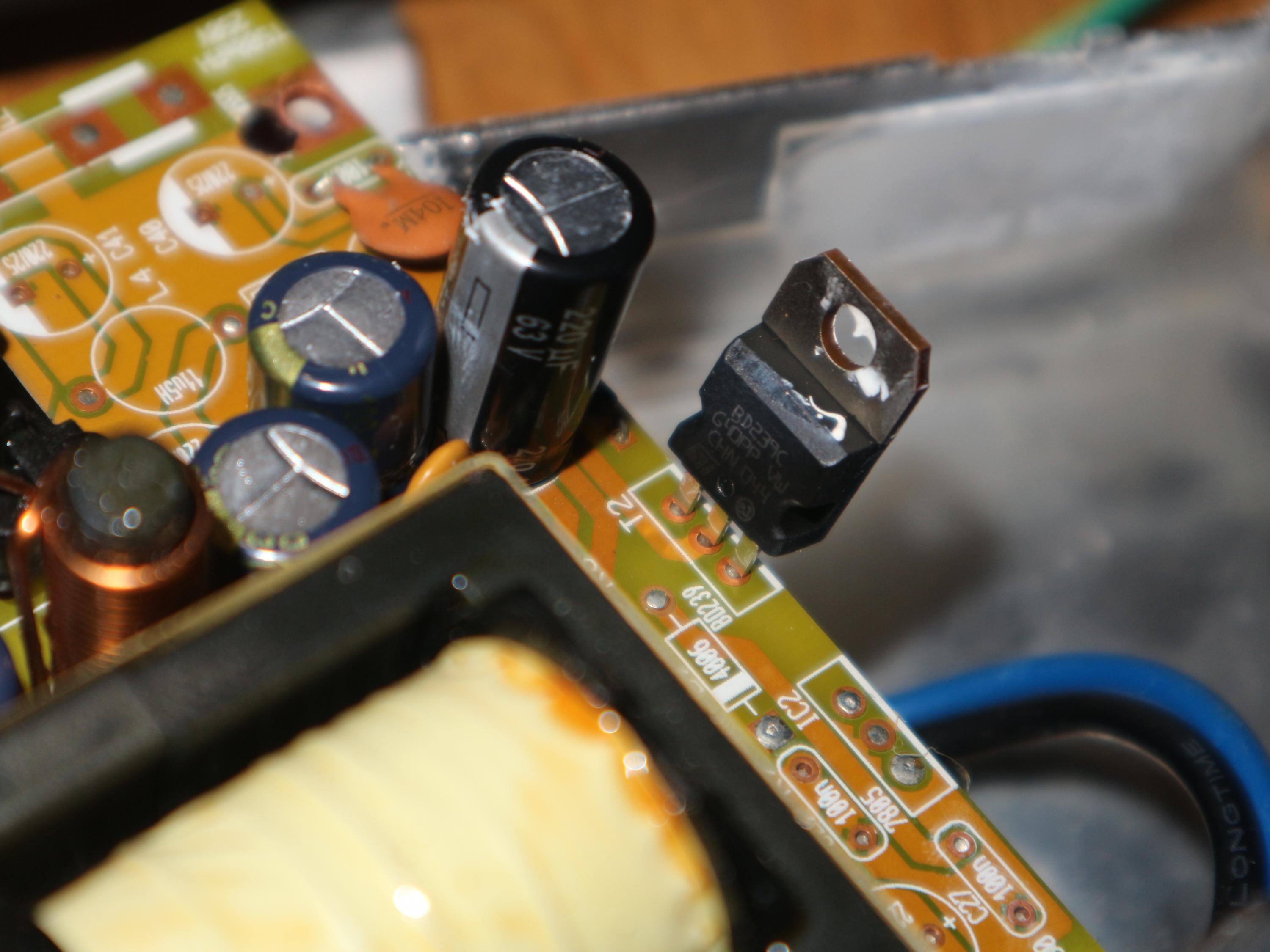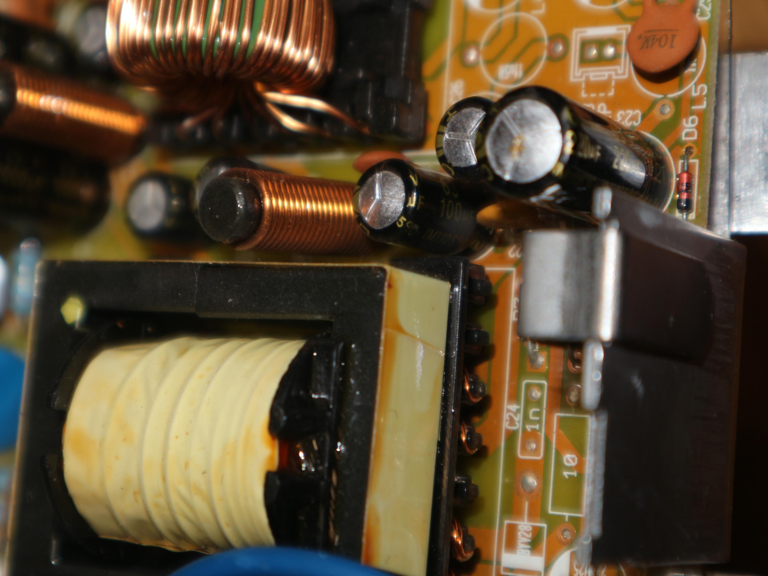 I first noticed a capacitor next to the transformer with obvious bulging at the top so that was my obvious first candidates.