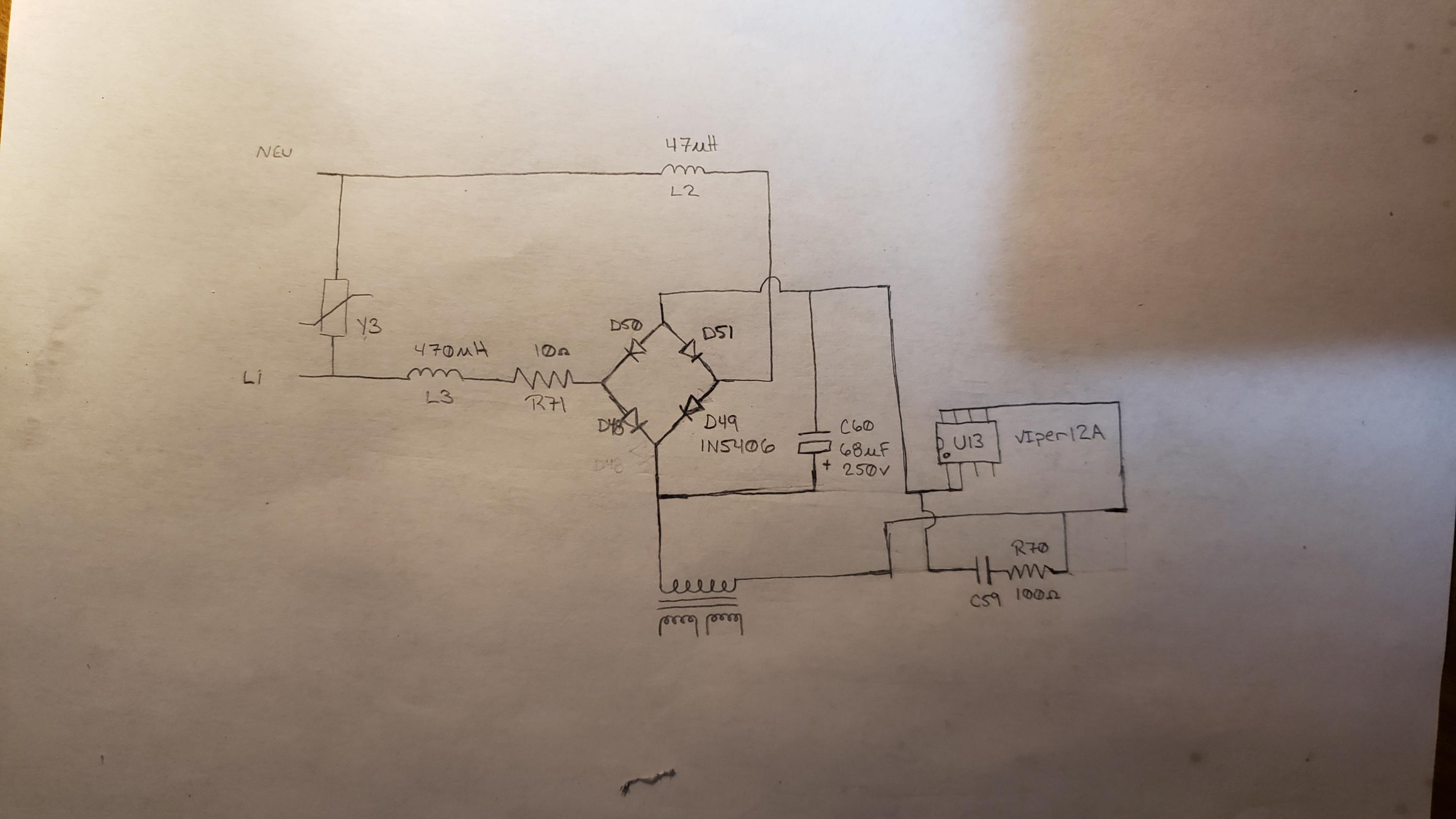 I started to trace out the circuit, curious why there is so much draw causing the 10ohm resistor to open. I believe the power circuit is a switch mode power supply? Sorry still kind of a noob.