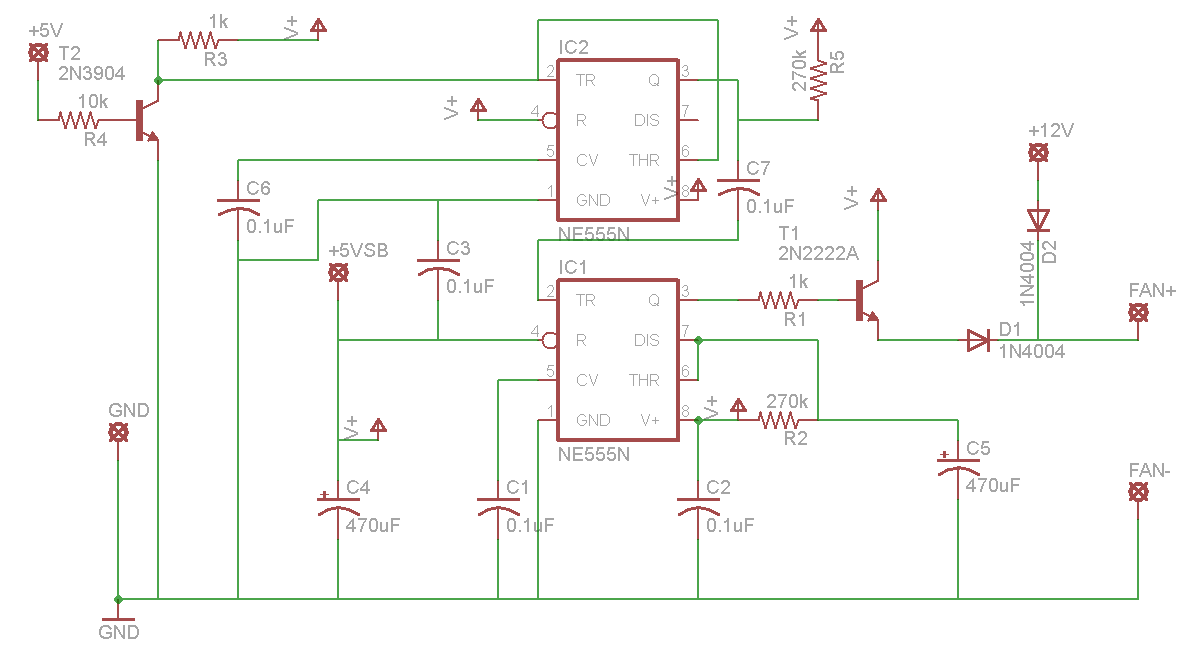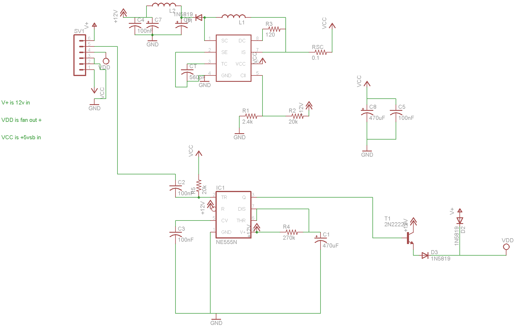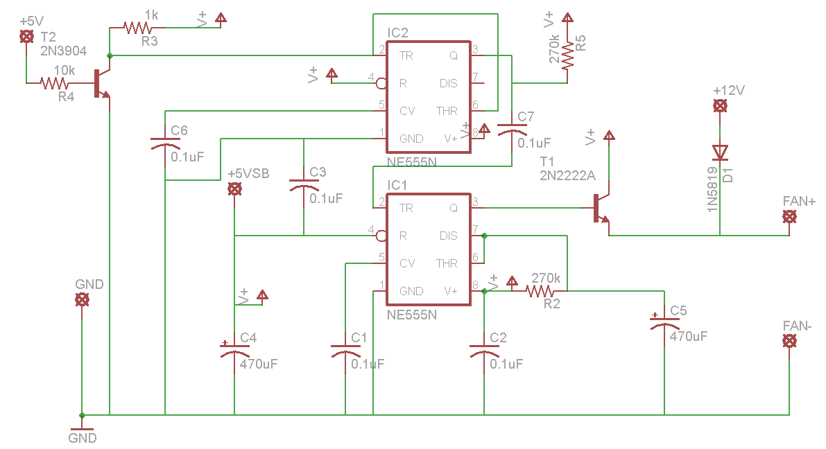 It uses two 555 timers, a 2N2222A transistor and a 2N3904 transistor. One change though from the schematic, for D1 and D2 I used 1N5819 schottky diodes, so there'd be less voltage loss. My EAGLE libraries don't have that part though. I tried to make many of the component values the same to minimize the number of different parts. R2 and C5 control the length of time the fan runs after you power down - with these values it runs between 2 and 2.5 minutes. I know there are probably better, more efficient ways to do this, but I used the parts I have on hand. I know that PSU fans are 12 volt, and some won't run on only 5 volts, but this runs then at 12 volts (minus the diode voltage drop) until the PSU turns off, and then the 5 volts kicks in. Withe the two fans I tested this on (one 80mm and one 120mm) the 5 was enough to keep them spinning.