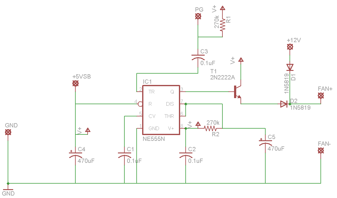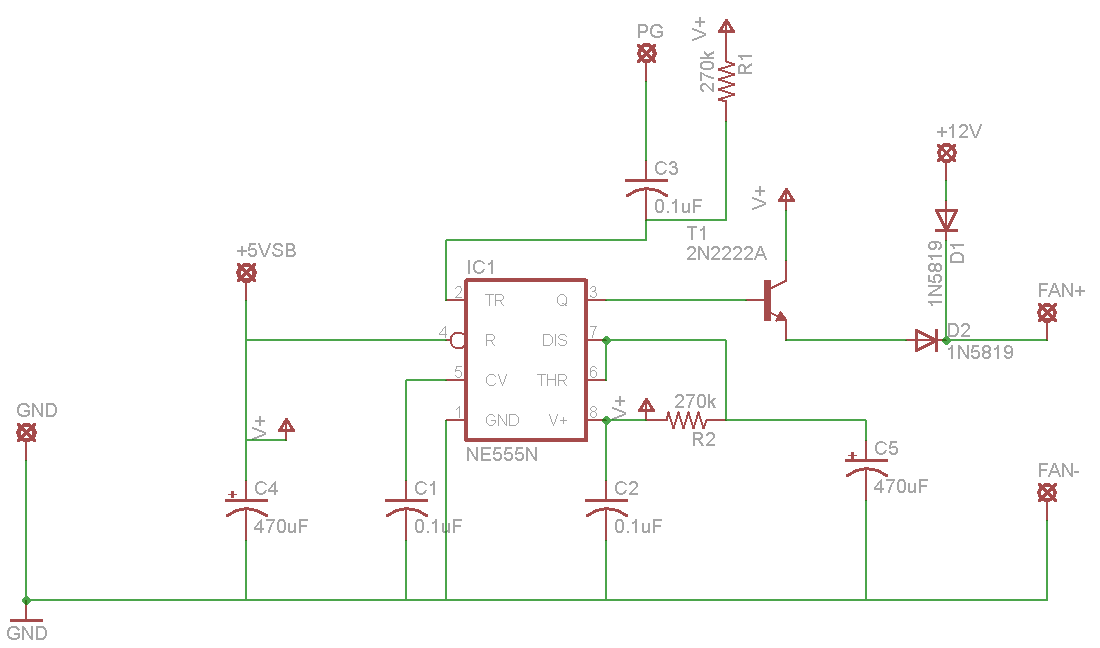 So I was bored yesterday (and avoiding my homework) so I decided to come up with a circuit that would keep the PSU fan spinning after you power down the computer. The only way I could think of to do this off of the 12v was with a giant capacitor...and that wouldn't work so well....so I made one that runs off the +5vsb rail.