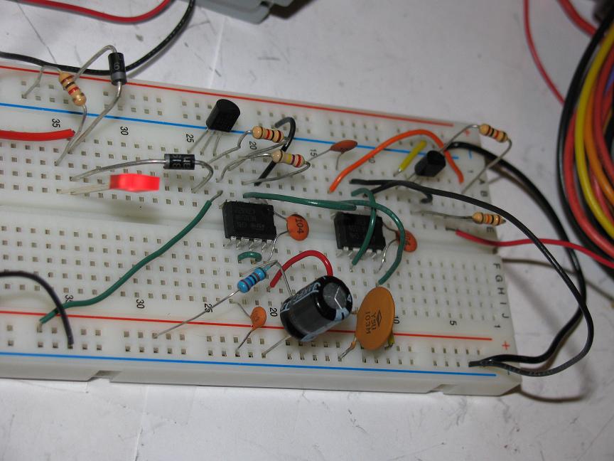 Here's a picture of it built on the breadboard. The LED is there so I don't have to sit there with my hand over the fan to see if it's on or not. It's not in the schematic.