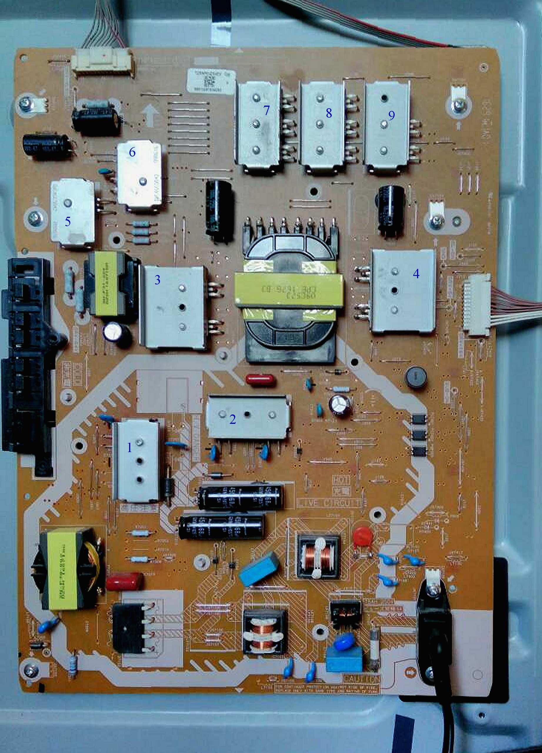 However, there is power on the TNPA6232 power board, mains in, high voltage on the main caps (450V, rising to 600 odd volts - and the caps are only rated at 450V!) and 80V rising to 100V and 18V rising to 24V on the top centre caps. Inititally, the voltages are at the lower figures, then after a minute or so, the higher voltages can be measured, but the TV still fails to show any signs, or respond to the remote control. I daren't leave it on very long, as the main caps will likely blow!
