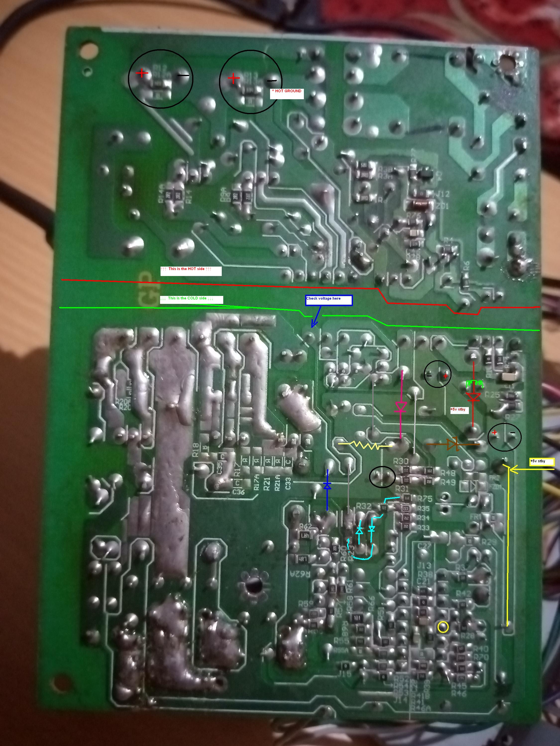 When checking voltages on the hot side, use the negative of the large cap or the negative of the bridge rectifier. In this case there are two large caps so you must use the one connected to the negative of the diode bridge, NOT the negative of the other large cap.