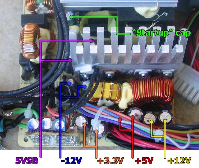 For the 5VSB rail, I only changed the bad Ltec LZG, 10V, 2200 uF cap with a Panasonic FM, 6.3V, 2200 uF. The Panny FM is significantly better in terms of ESR and ripple current compared to the Ltec LZG (2470 mA and 0.018 Ohms impedance vs. 1920 mA and 0.030 Ohms impedance.) Deviating from the original PSU cap specs is usually not recommended. But in this case, it’s the 5VSB rail, which often does well even with very low ESR caps like Panasonic FM and FR, along with Rubycon ZLH.