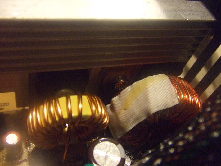 Now with the cover off. You can see the transient filter over there, came with a nice coil and two 2000pf Y caps. The original X cap was a small .1uf one, replaced with a .47uf one. The bridge rectifier is a 600v, 6A part, I added that heatsink. The main caps are 200v, 820uf. What brand? This is the shocking part, I will cover that.