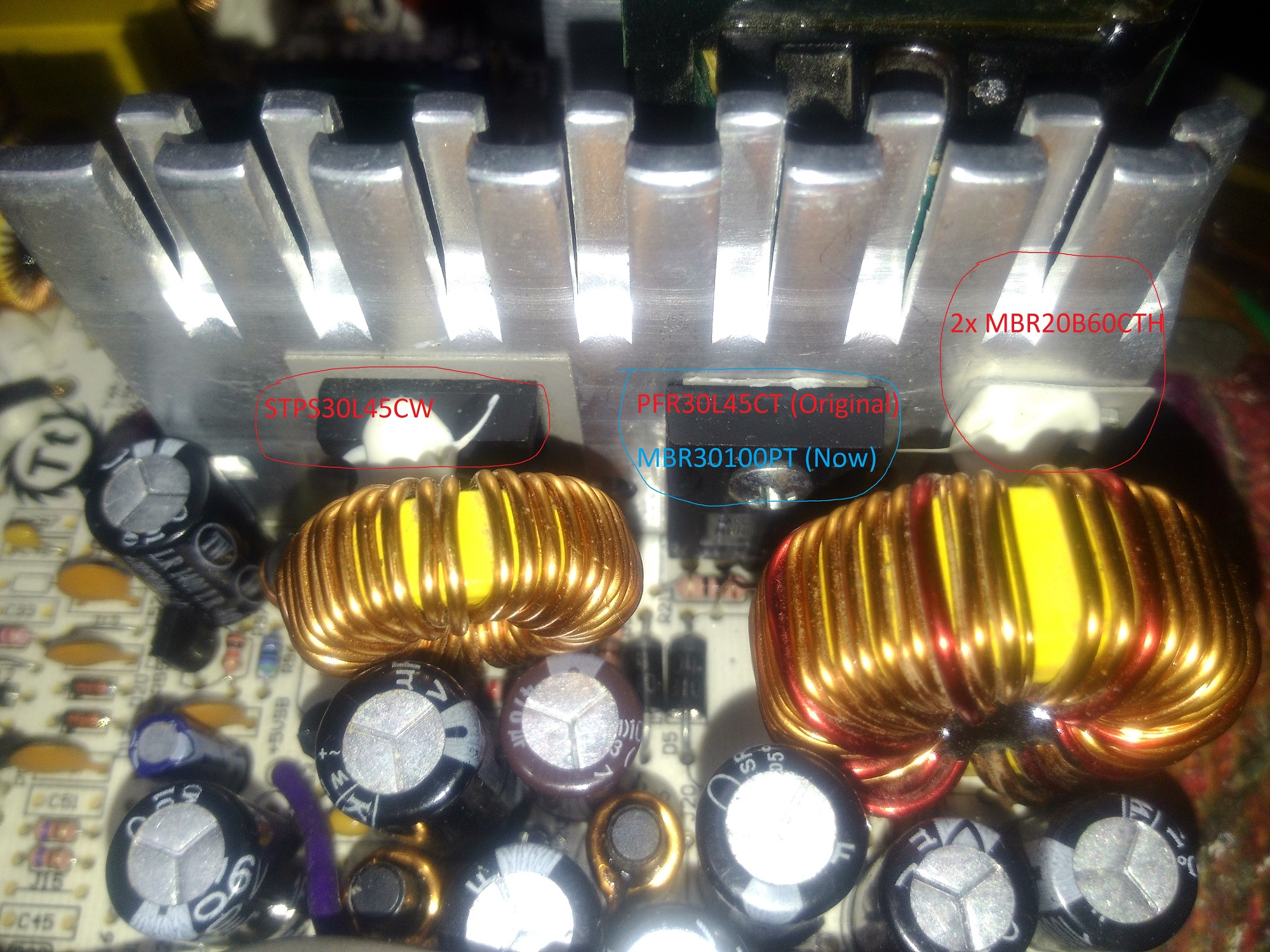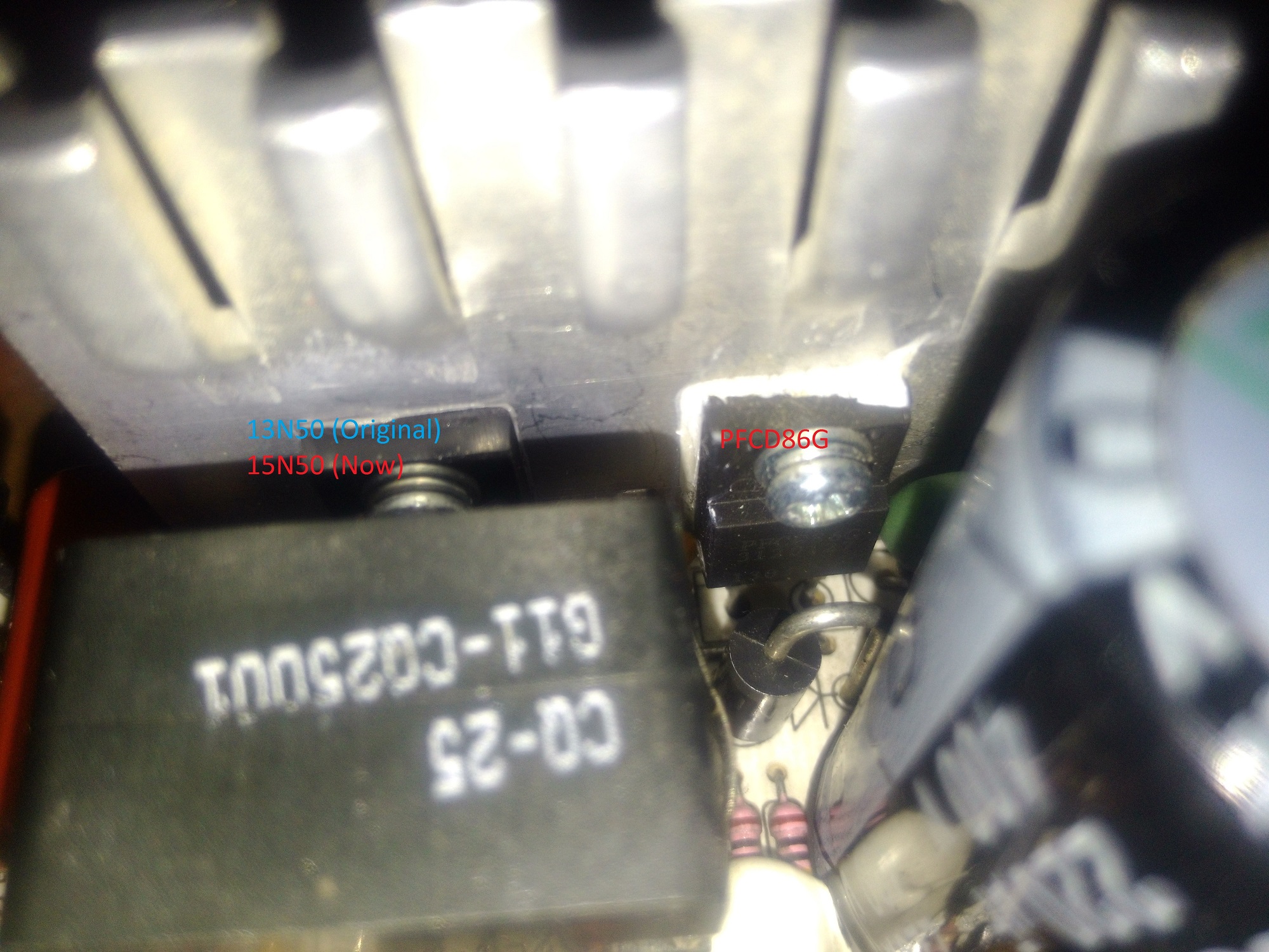 One of the 13N50 Mosfet in the middle heatsink is shorted and the PFR30L45CT diode in the secondary heatsink also shorted.