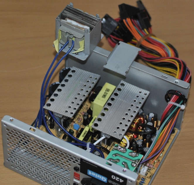 Another thing to look at is the half-bridge coupling cap -- that dipped red one. It is much smaller than it should be for 400W rating. Usually it is a few uF at 630V. The size dictates the maximum primary current (well, the dI/dt, but with a fixed inductance and on time, fixes the maximum current.)