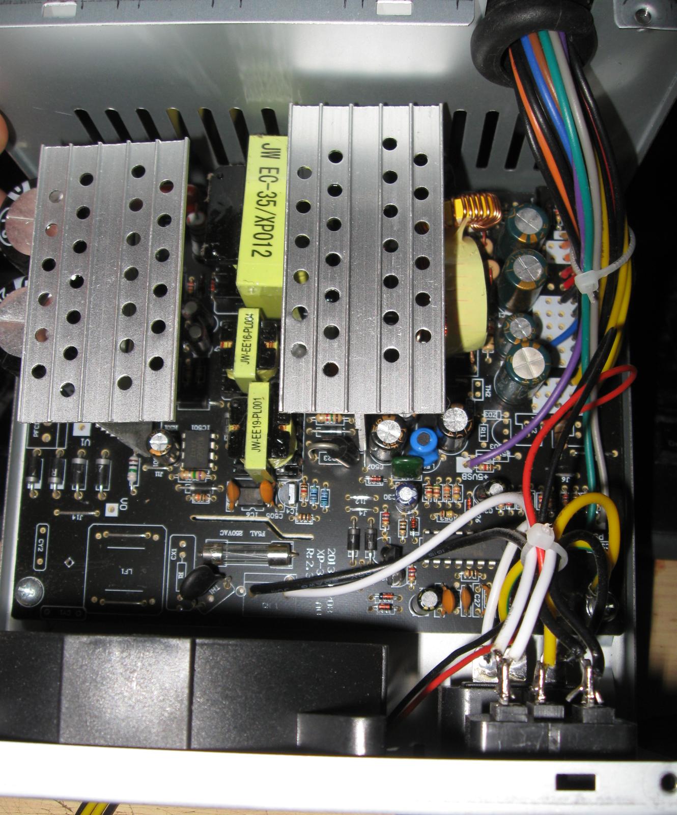 The "new" unit is a KDM-M6480 480W psu, the 480W number is a typical KDM bullshit claim of course, but the 24A rating on the 12V rail seemed reasonable and the "Active PFC" claim gave me a bit of hope that this was going to be decent-ish.... -