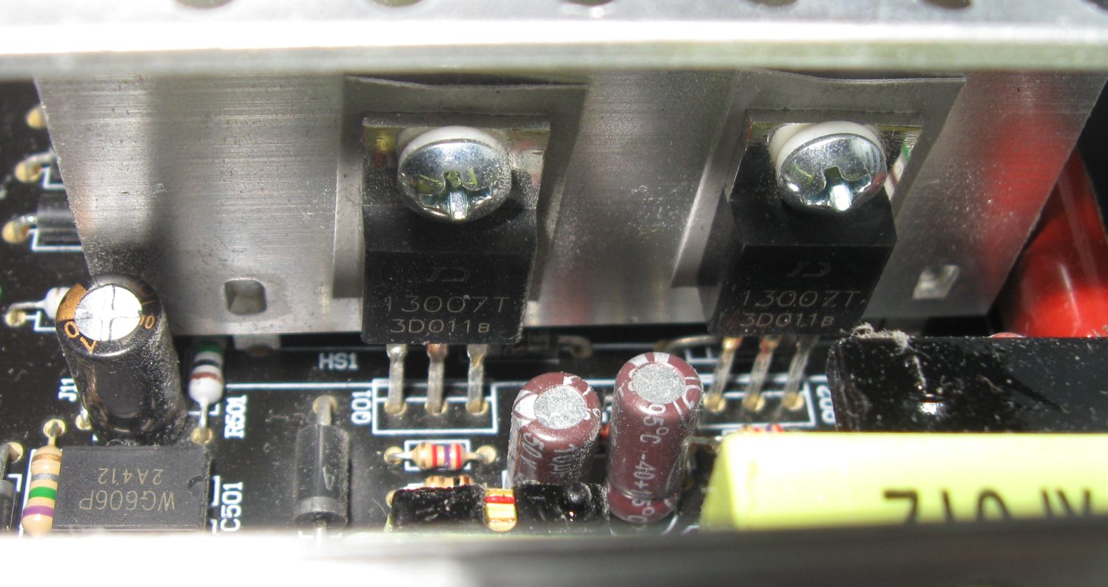 Primary capacitors claim to be 330uF - I don't care enough to measure them, I'm sure they're probably 220uF. 13007 transistors in theory could give it 250-300 watts but no way with that main transformer.