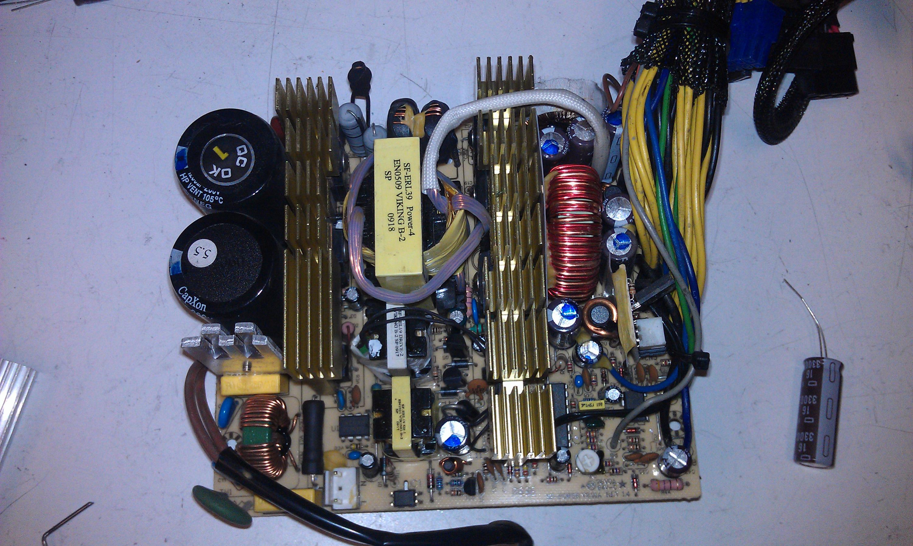 Azza Dynamo 850W. Paid $20 for it, sweet deal! Obviously Super Flower made. It would boot up for about 3 seconds and then shut down. I figured, hey, those bulged caps might have something to do with it