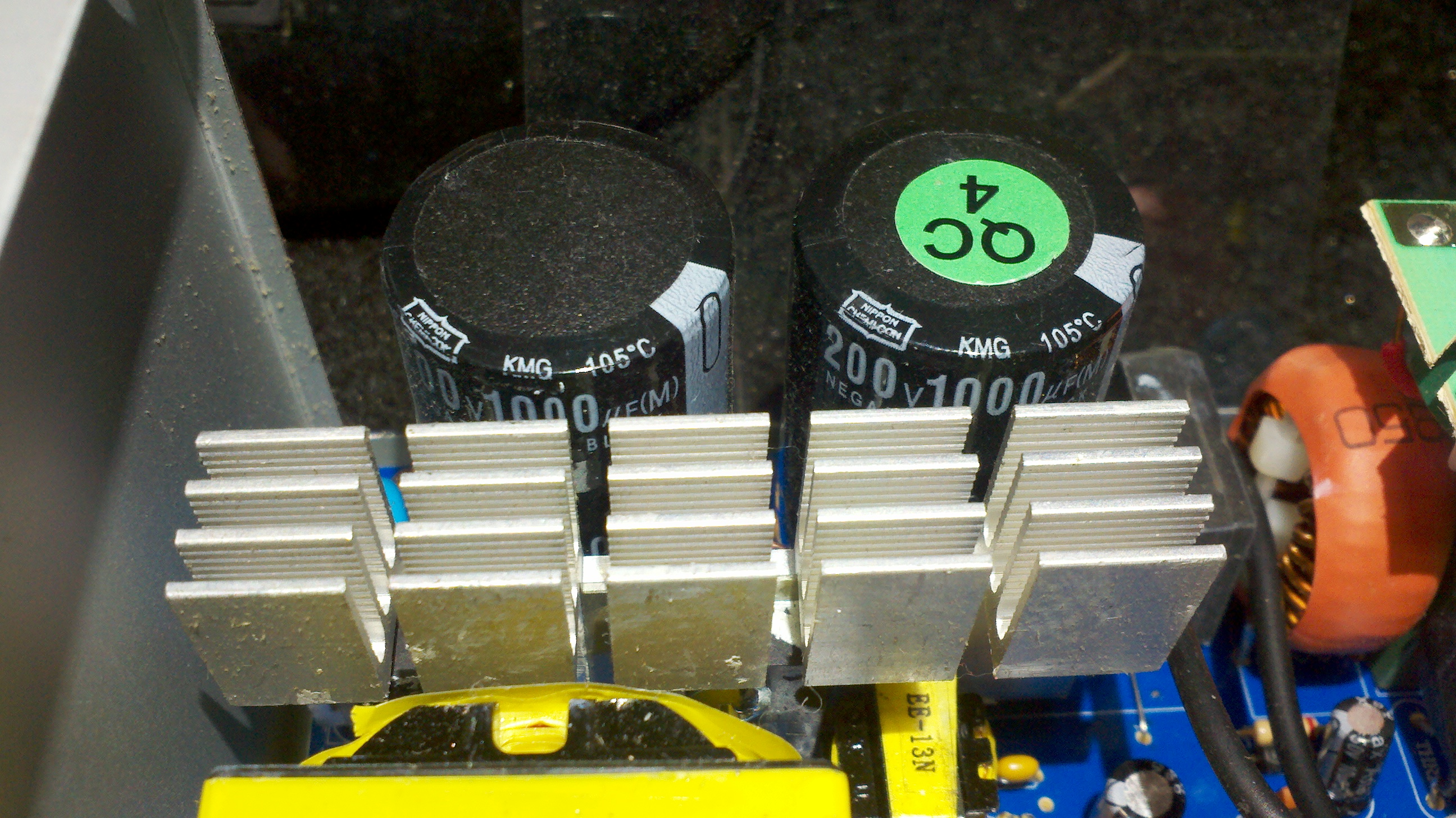 Look at those beefy CapXon! They measured 1200uF too, good job CapXon! They're heavy too. 15A bridge on a heatsink