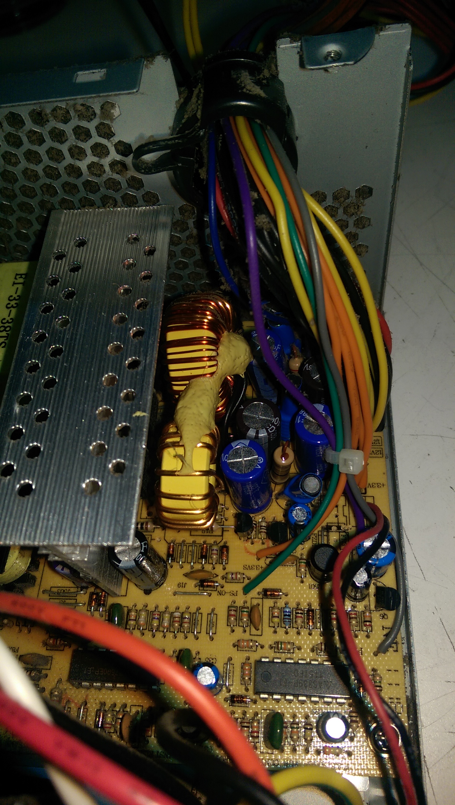 I can't believe this thing still works. It powered an Athlon 64 X2, GeForce GT440 system for who knows how long. And all that dust was acquired from a slow spinning thermally controlled fan. How did those BH caps not die?! And look at the secondary, it looks clean. I didn't dust this thing, I took pictures as is. BR is 4A, switchers are D304X rated at 12A, 30A on 5V, 20A on 12V, 20A on 3.3V. It does have a slot for a second 12V rectifier. I'm thinking about fixing it up. Although, it does have all 20AWG wiring...Haven't checked the solder side yet.