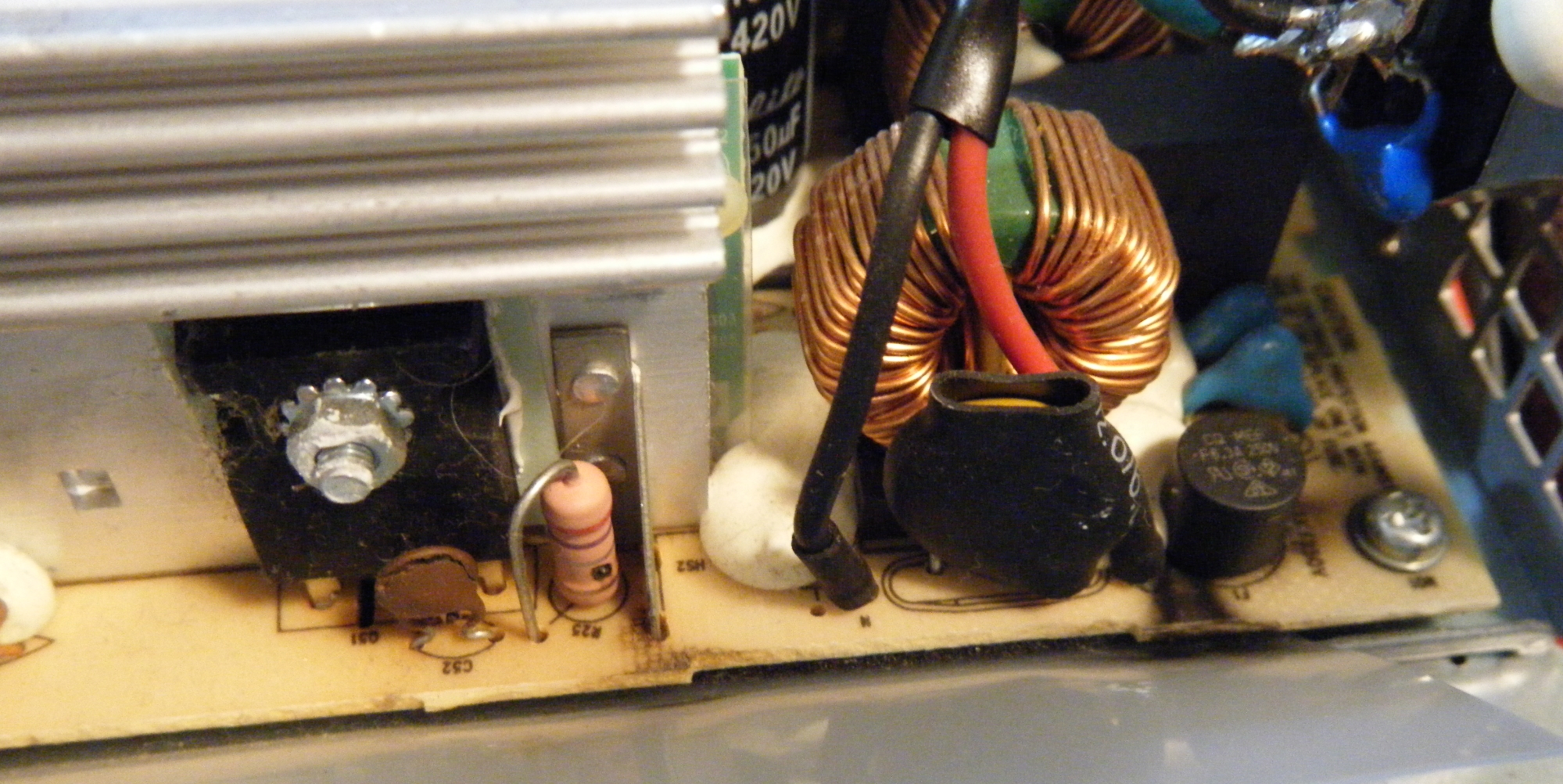 Also note how the heatsink is extruded! Interesting, they went to the effort to do that instead of doing what is usually done, using a [folded] bar of metal (This is done in the genuine PSUs as well, so it's not exactly poor practice)