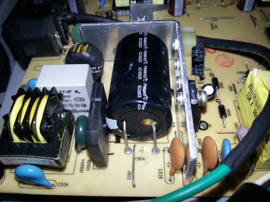 After some time with no signal (but the power light was on), it would display black with a snowy white border (but was OK when a signal source was applied) - when I opened it up, I found that the 450V 150uF Elite PW Series unit was leaking at one of its pins.