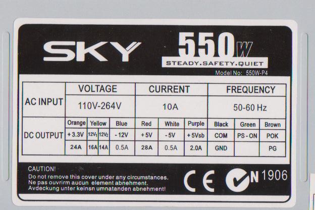 Sky 550 watt. It looks like TaiwanBreakDownComponents Company got the transformer right, for once as it's a real 35 size, but everything else is wrong. The transient input filtering is missing (other than only 2 Y-caps), the primary switchers claim to be 13009s, but they look too small. On the secondary, we have a 16A fast recovery on the 12v and 20A schottkys for the other two rails. All of the caps are BH. The primaries are 470uF. All of the rails have a pair of 1000uF caps on them, except for the -12, which has a single 470uF. The fan looks like an off-brand (HongGu). Probably could be re-built like my rexpower, but I'm not in any mood that at the moment, so it will probably just die a spectacular death on my load tester or get the sledge hammer treatment.