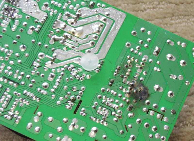 This was shawly not a 500W like it claimed to be. Notice the heat damage on the output. The wires were melted near the PCB. The funny thing is that when I peeled off the label with the SHAW brand, there ws another label claiming it was a Ritmo. Any ideas who made it? Maybe TaiwanBreakDownComponents Company? The heatsinks were OK-ish, but the 5vsb transistor was a total joke - about the same size as the one on kc8's echo star 480.
