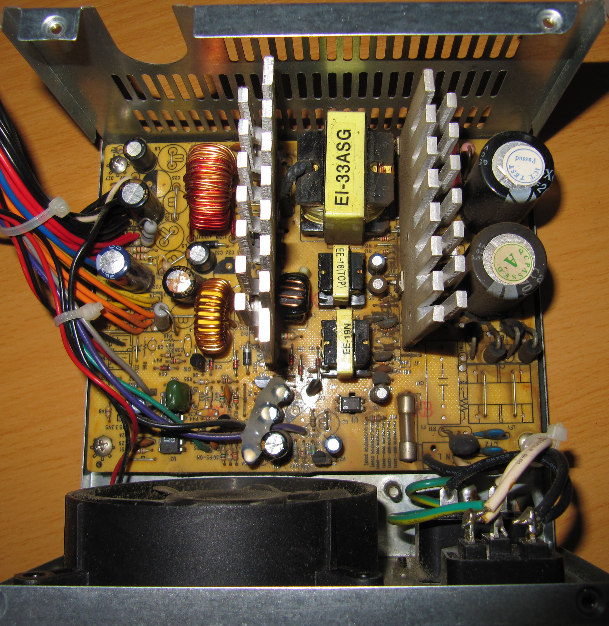 The pcb has spots for 2 output caps per rail and pi coils, but none has been installed! 2 caps are bulging.