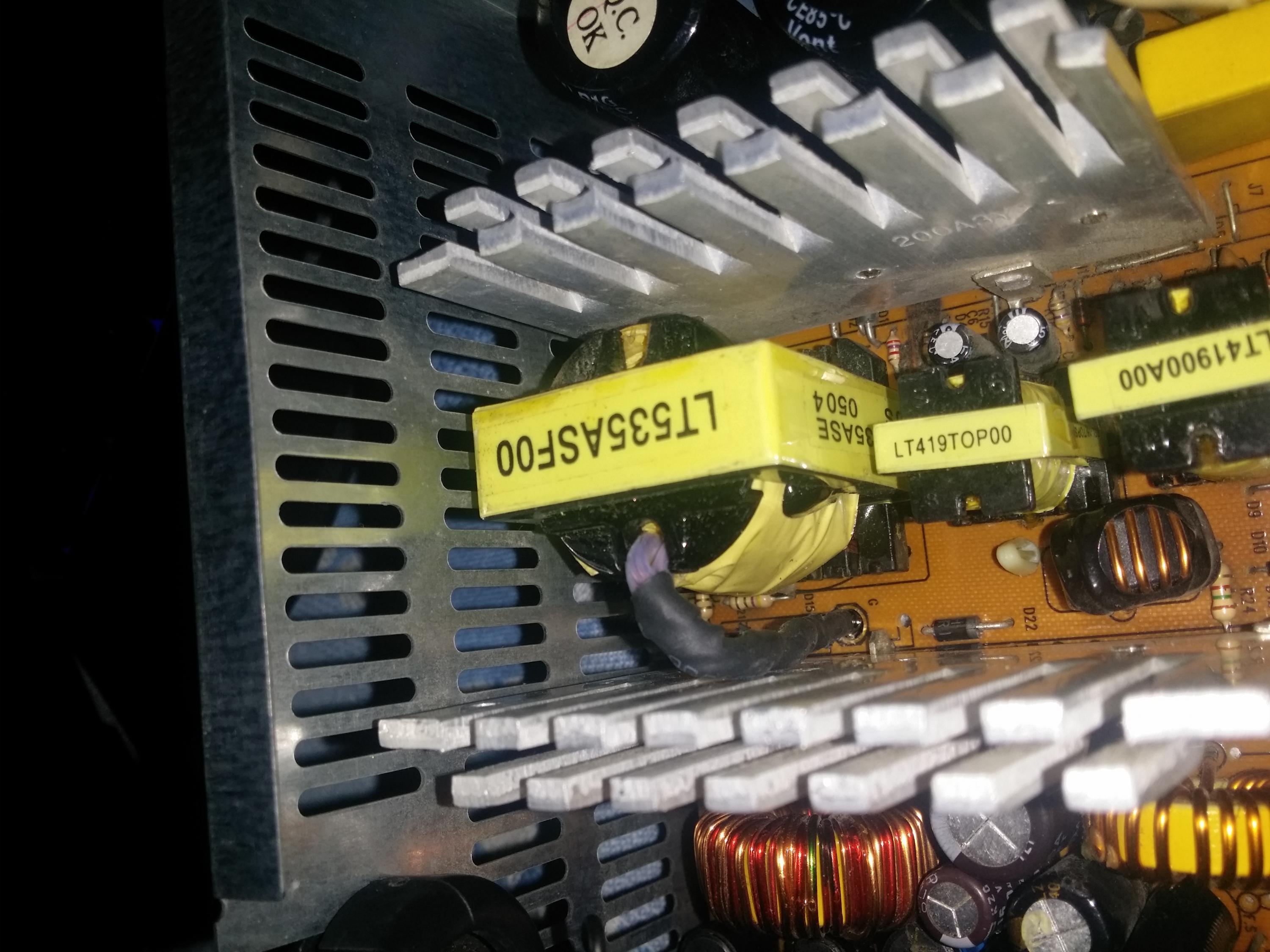 The pcb has spots for 2 output caps per rail and pi coils, but none has been installed! 2 caps are bulging.