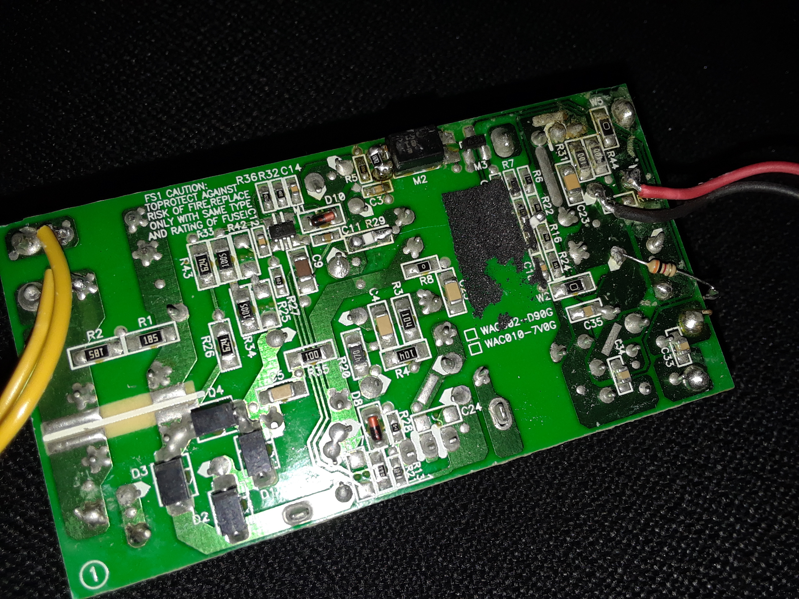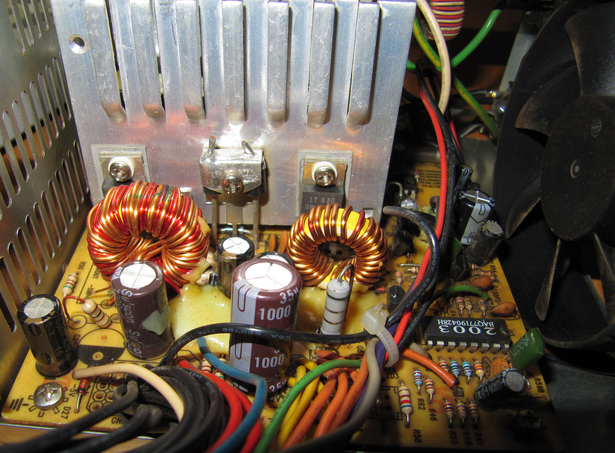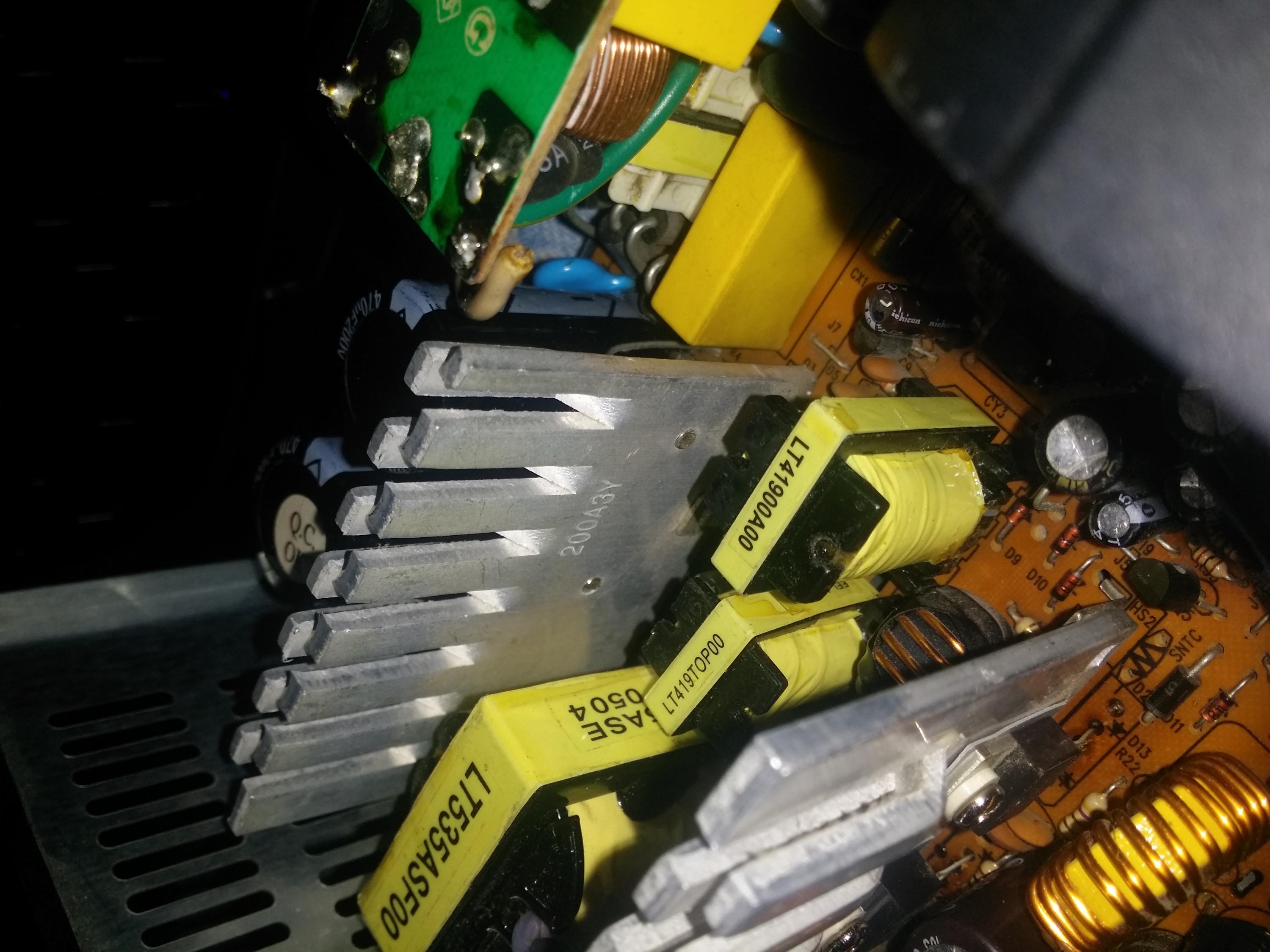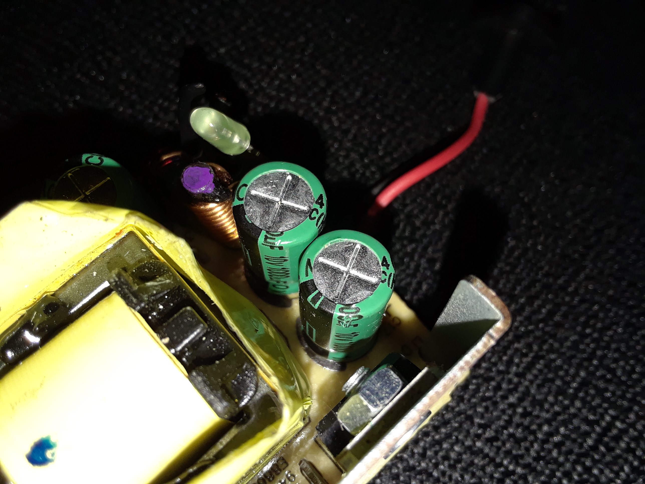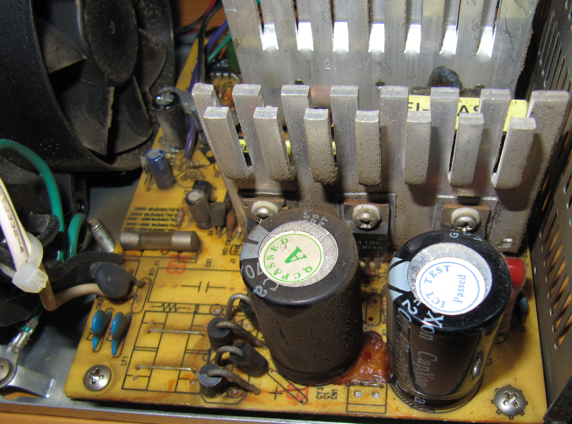 The pcb has spots for 2 output caps per rail and pi coils, but none has been installed! 2 caps are bulging.