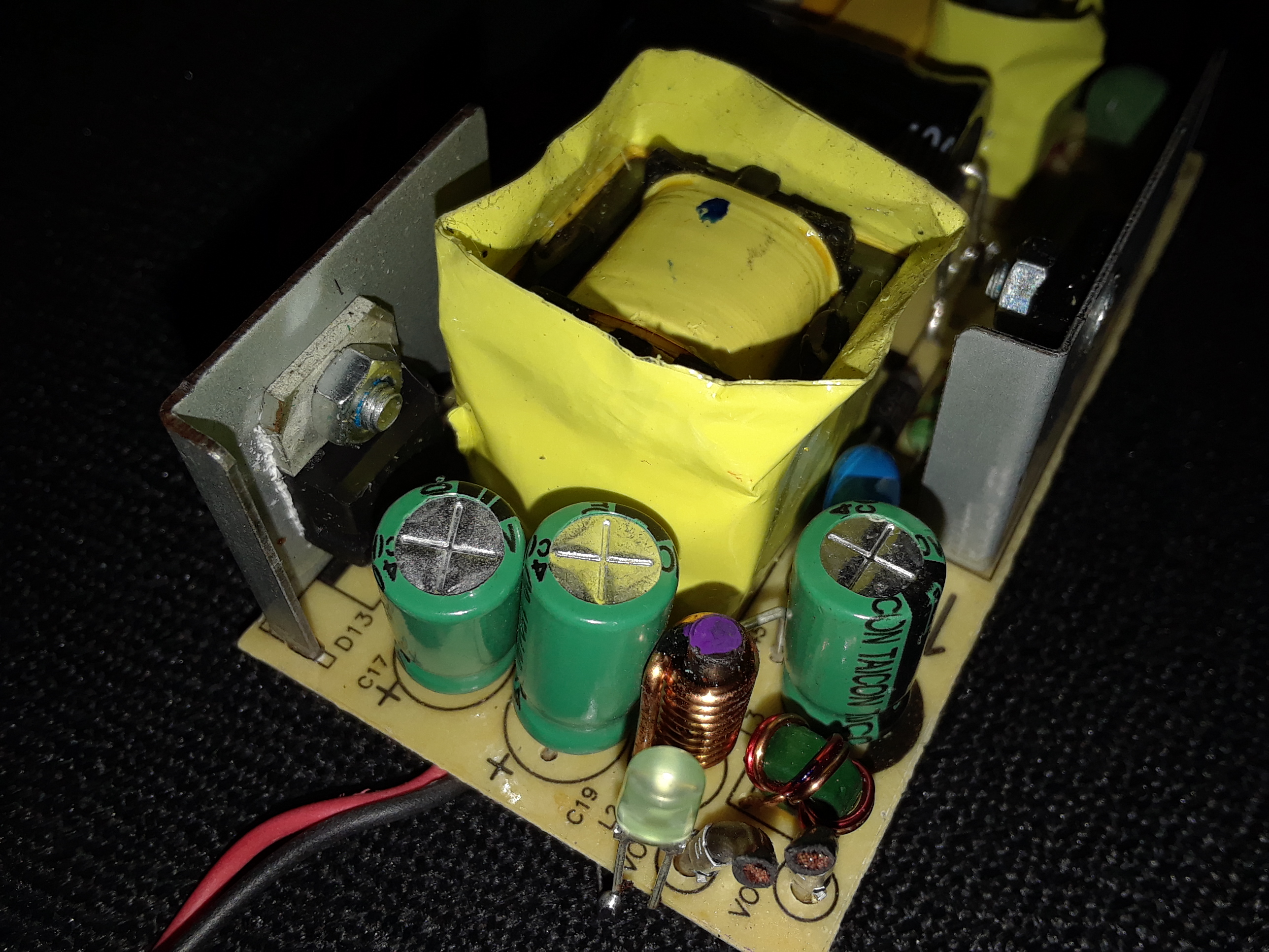 The pcb has spots for 2 output caps per rail and pi coils, but none has been installed! 2 caps are bulging.
