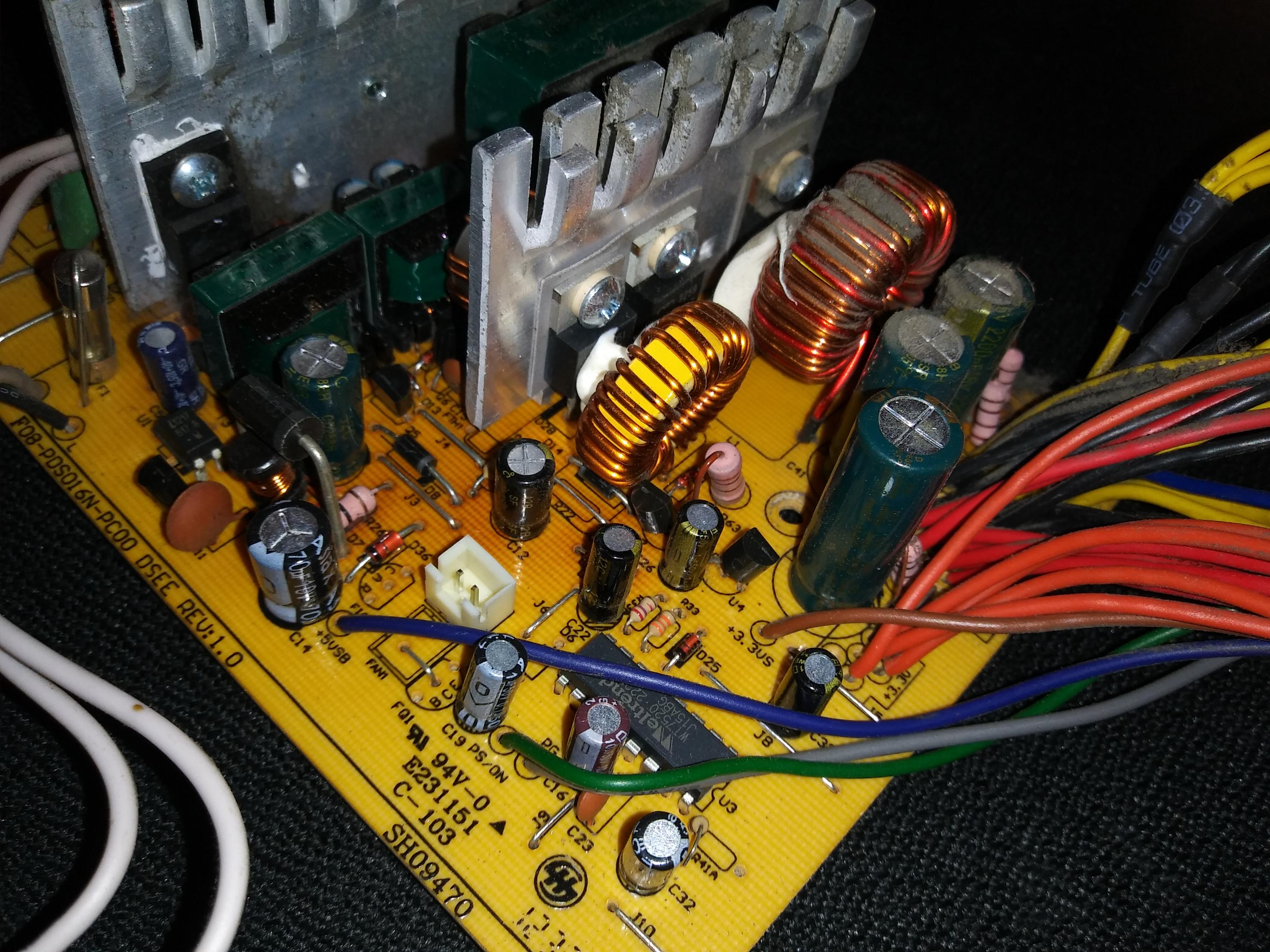 And that's only if you ignore the massive ripple and noise that would be present on the output at that power level. With a single cap per rail, good luck trying to get more than 150 Watts out, if even that much (though the design can impact that a little... but in a cheapo PSU, I doubt it).