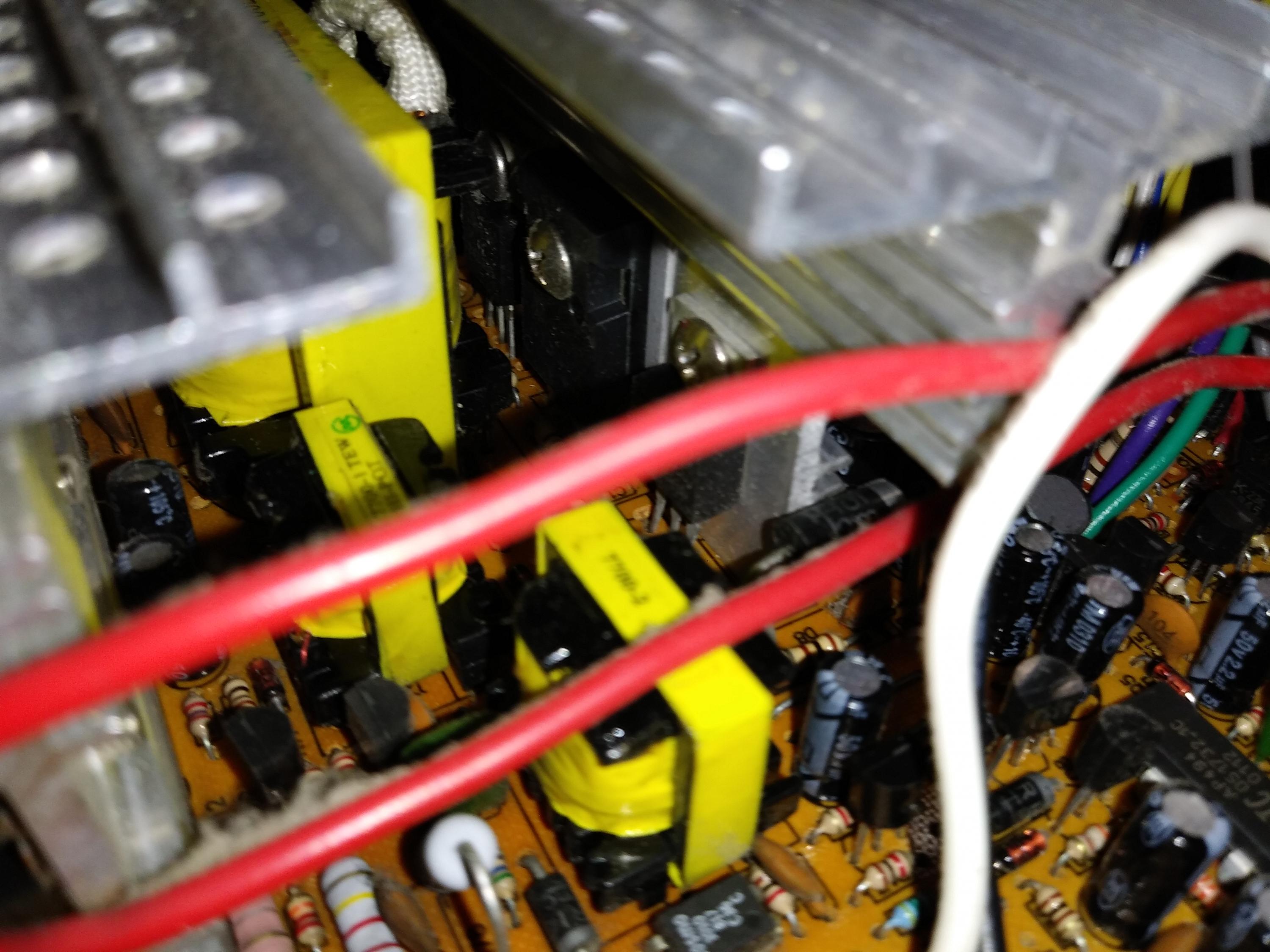 Next up the input. The main thing that I noticed is that the input choke(red and white wire) looks like it is wound with telephone wiring. It has to get hot. The input caps are Capex. The "Y" caps are 1KV common ceramics, NOT safety caps. The three semiconductors on the high side are
