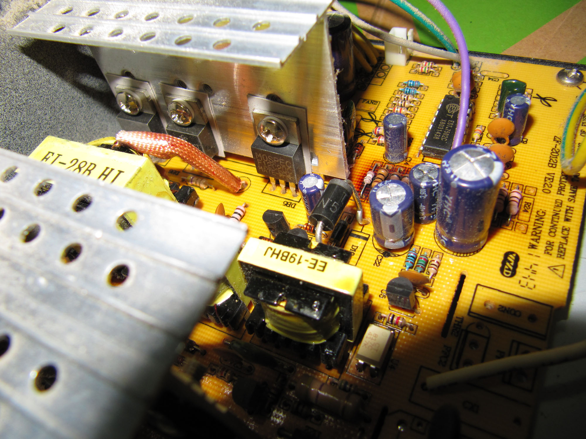 The fan was not seized when I found it (so I kept it ), so the cause of failure wasn't actually excess heat, but likely overvoltage ! Look at those caps more carefully: only 200v rating ? There's no PFC here, so although B+ doesn't go as high as 400v, I know for a fact it's still around 300+ after the bridge rectifier, making a 200v rated cap about 100v too low ! Could it be they're in series ?.....but that would also drop capacitance ! I tossed the board now, so I forgot to check, for curiosity's sake. TBH, I didn't even notice that 200v marking until just now when I was transferring the photos off my phone to upload them Am I mad ? 200v caps on the hot side of a SMPS ? Is it intended for a 110v country ? Maybe they were in series after all....:|