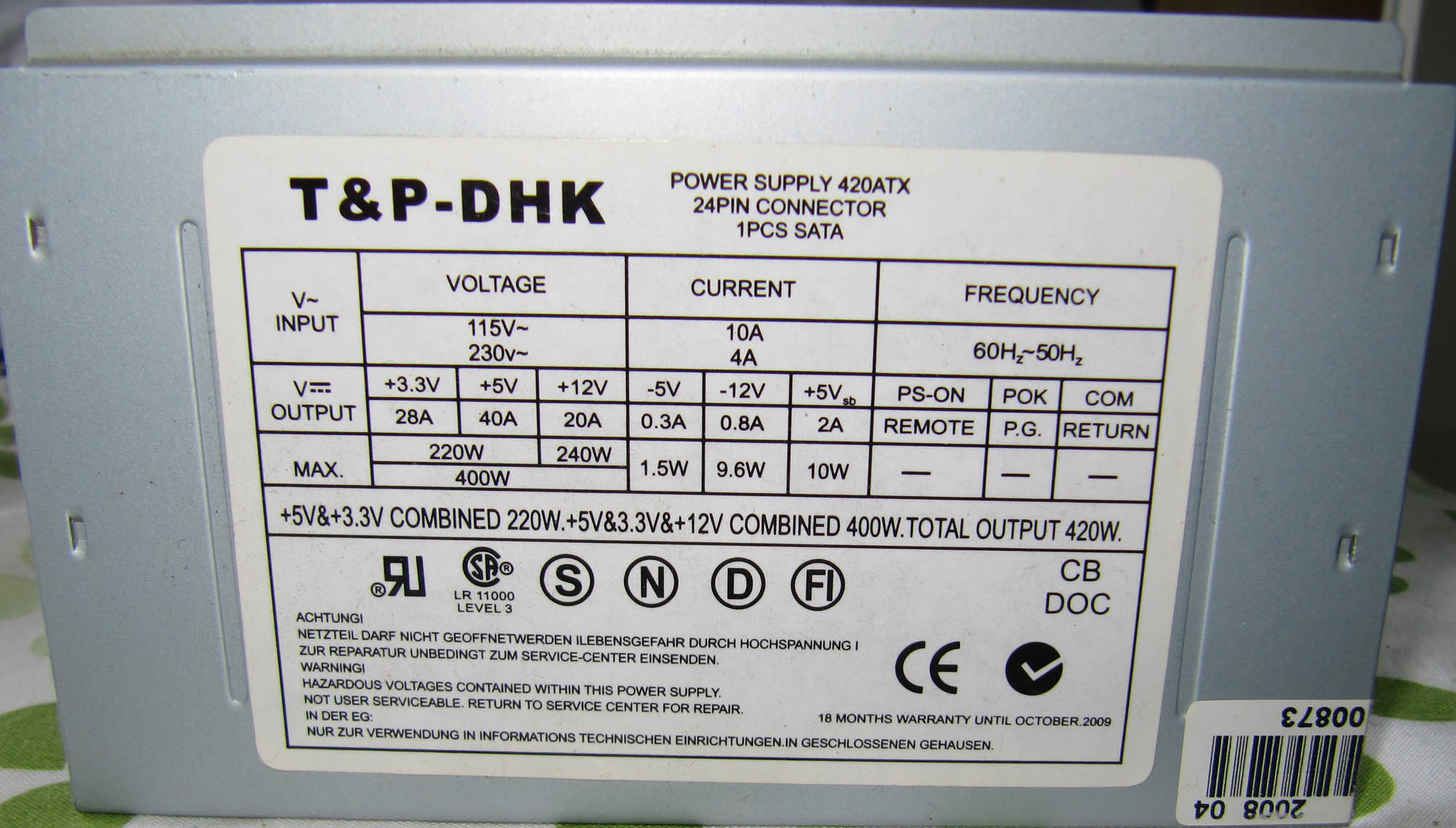 The "new" unit is a KDM-M6480 480W psu, the 480W number is a typical KDM bullshit claim of course, but the 24A rating on the 12V rail seemed reasonable and the "Active PFC" claim gave me a bit of hope that this was going to be decent-ish....