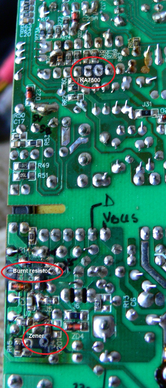 A couple weeks ago, my dad got a semi-fried SmartPower 500W from a cousin of mine. First-look "diagnosis": all the big "Fuhkyuu" bloated (even the primary ones), one resistor "well-done" (from the 5vsb area to the PFC controller chip, most likely its Vcc), one "tanned" zener in the same area, two pins of the KA7500 controller somewhat burnt.