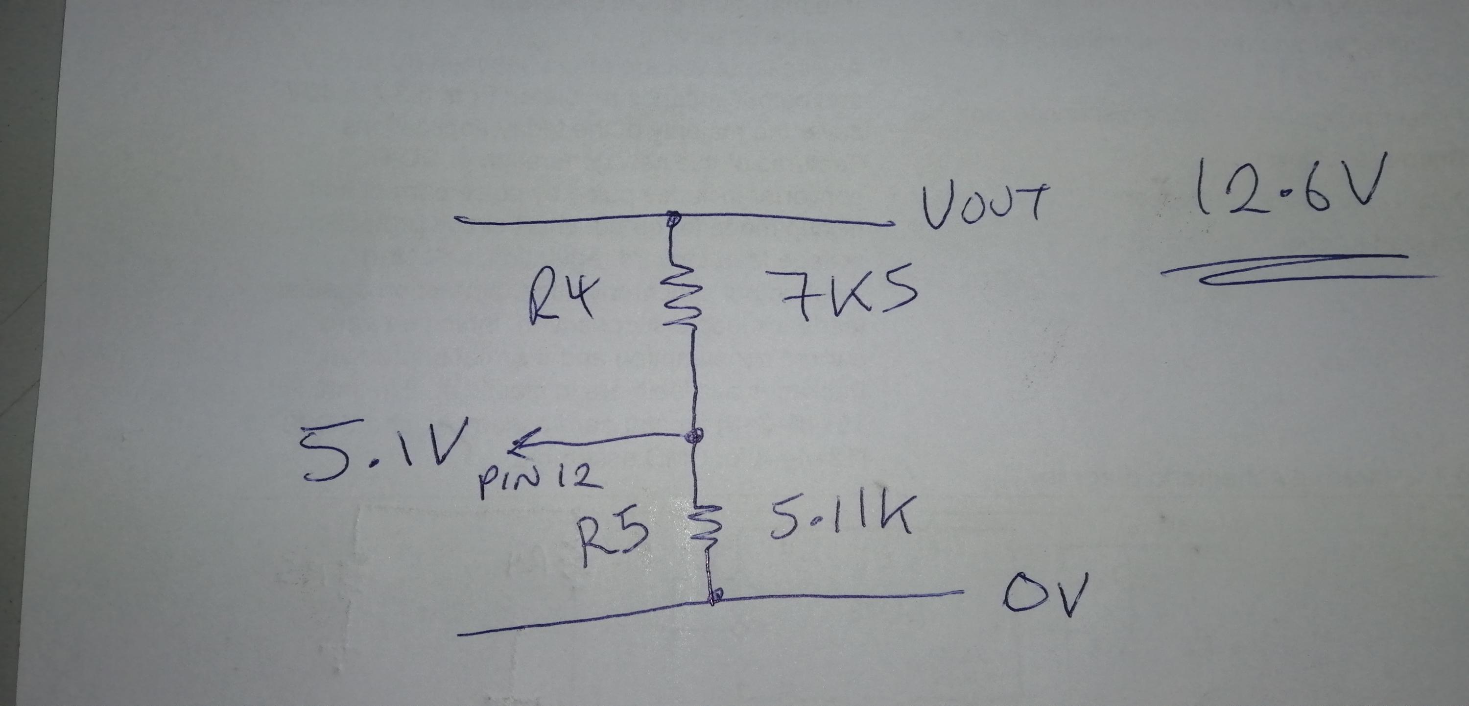 I have resistors R4 and R5 (see pics attached). These look like R4 7.5K 1% from Vout to pin 12 and R5 5.11K 1% from ground to pin 12. The datasheet shows some example values but doesn't seem to contain the formula to calculate the output voltage from the resistor values