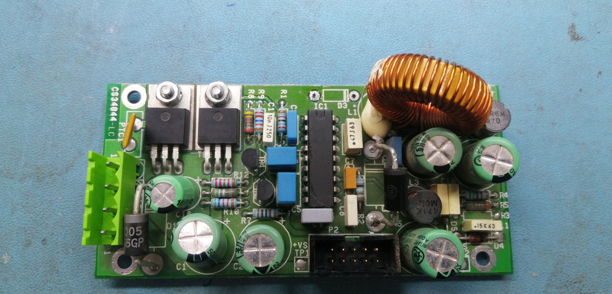 It takes an input of 28V and should output some lower voltage. When I first looked at it I found that there is a zener diode D3 directly across the V out to ground and it was short circuit.