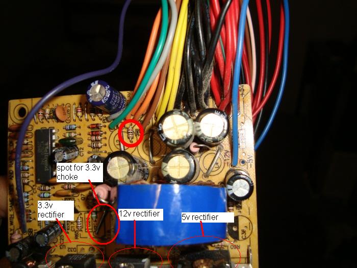 If you want some more work and have some solder wick or a good solder sucker, you can replace the secondary side rectifiers. I circled them in the picture I attached, as well as the missing 3.3v choke. What psu's did you get these parts out of? You can try taking the rectifiers off those too and use them to beef this one up. I usually beef up the secondary rectifiers so that if anything blows it will be the primary switchers, and if they blow they almost always won't take the attached hardware.