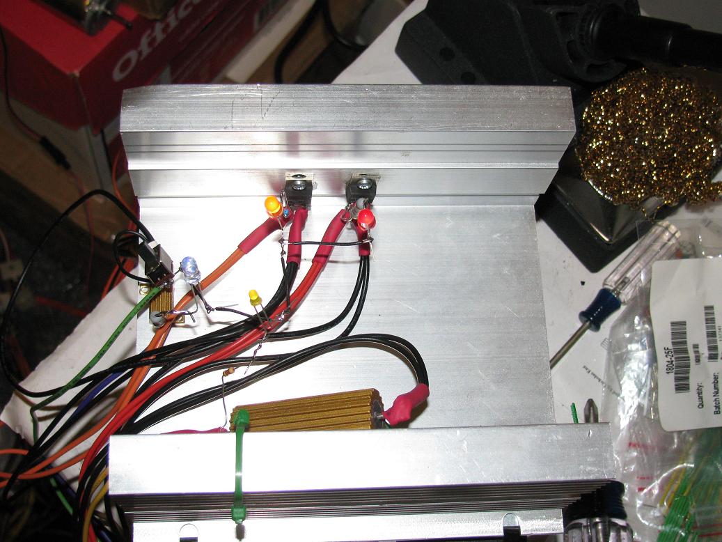 Not a real heavy load, but enough to make sure things are working properly, and the load is even enough for the voltages to be happy. I also added an LED for each rail. As I was searching through all my LEDs, I found that I could match the LED color to the color of the wires that carry that voltage. So there's a yellow one on the 12v, red on the 5v, orange on the 3.3v, and purple on the 5vsb. These let me know which rails are working, and are a good indication of whether or not the heatsink will burn me if I touch it (all 4 on = hot, only purple on = cold). The whole thing is powered from the ATX connector of the PSU. I used 2 wires (18 gauge, from an old power supply) for each power rail (except the 5vsb), and 6 ground wires. The switch shorts PS_ON to ground, turning the unit on and off. I know having the LEDs unprotected like that is very unsafe, but I didn't really want to put a whole ton of effort into making some nice LED board, and I think it looks pretty cool with them all floating like that