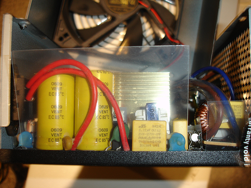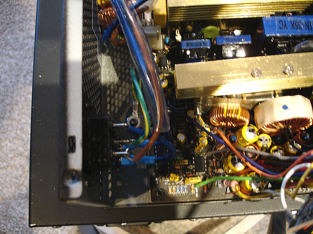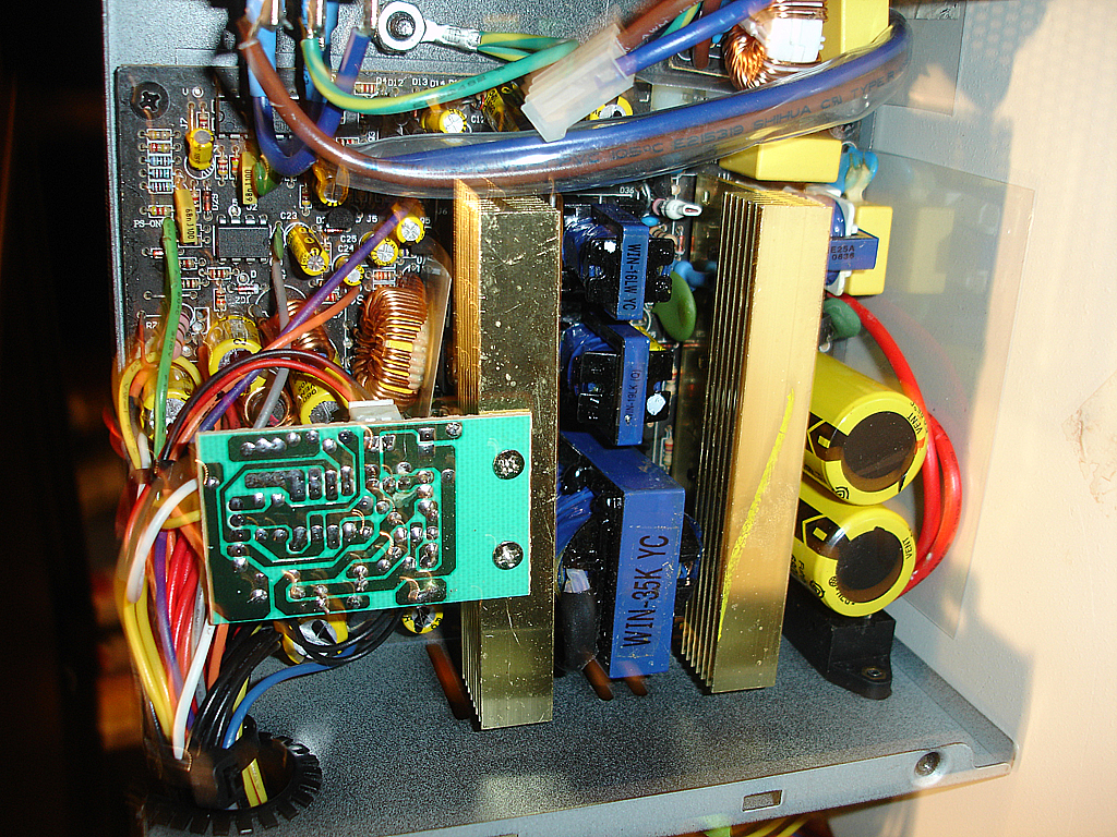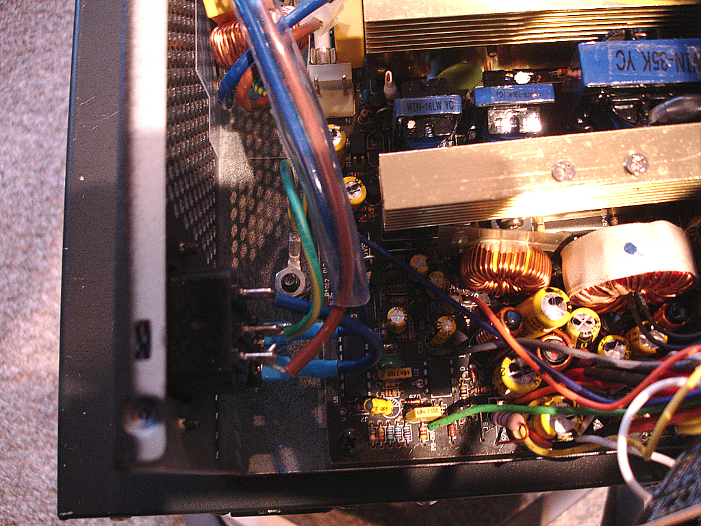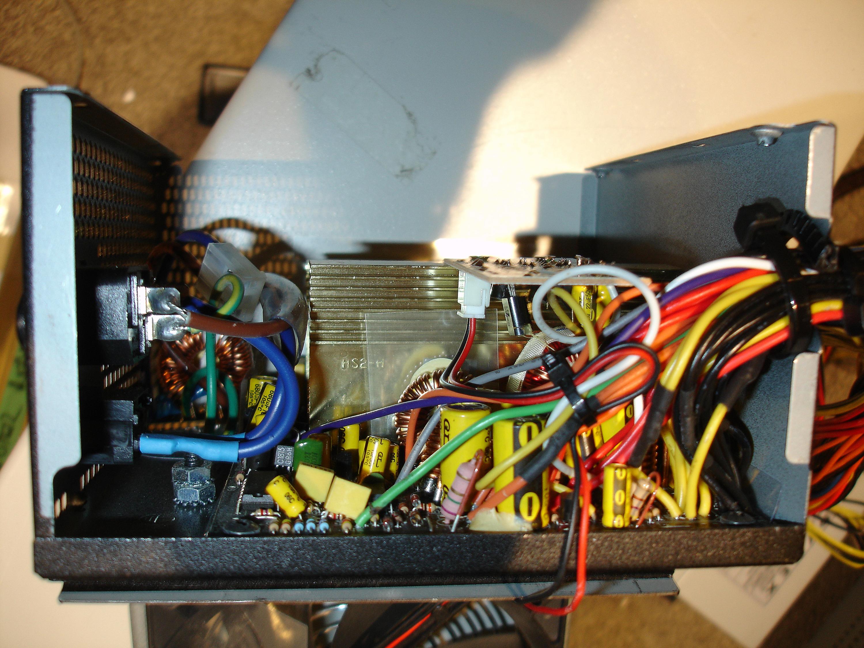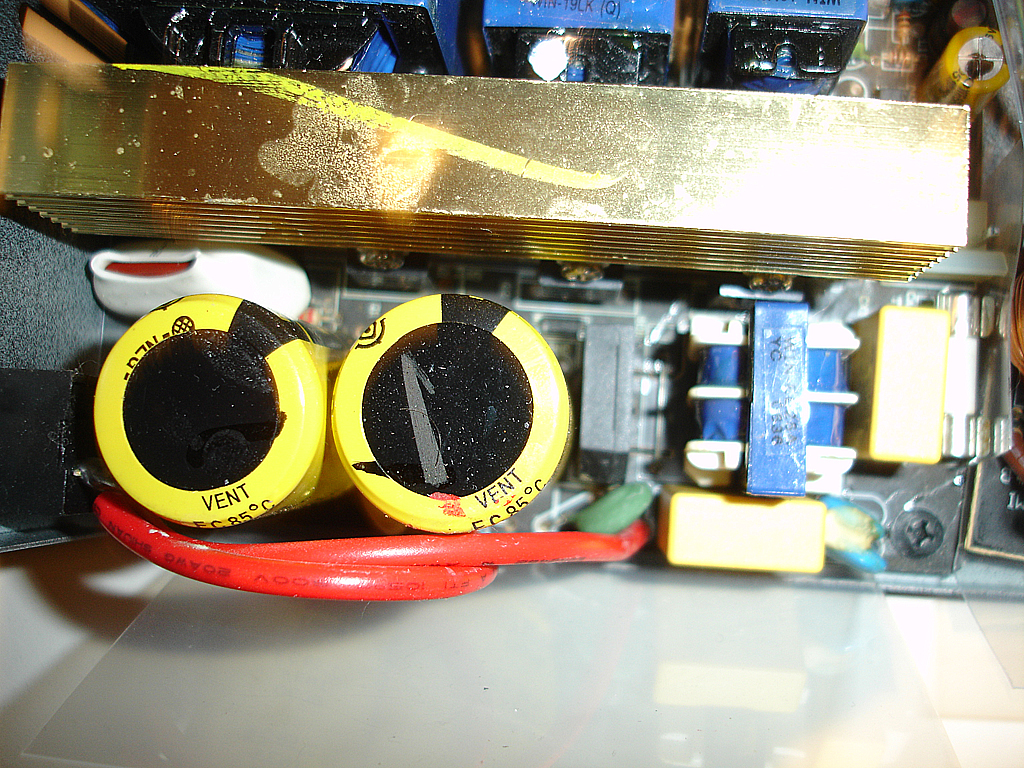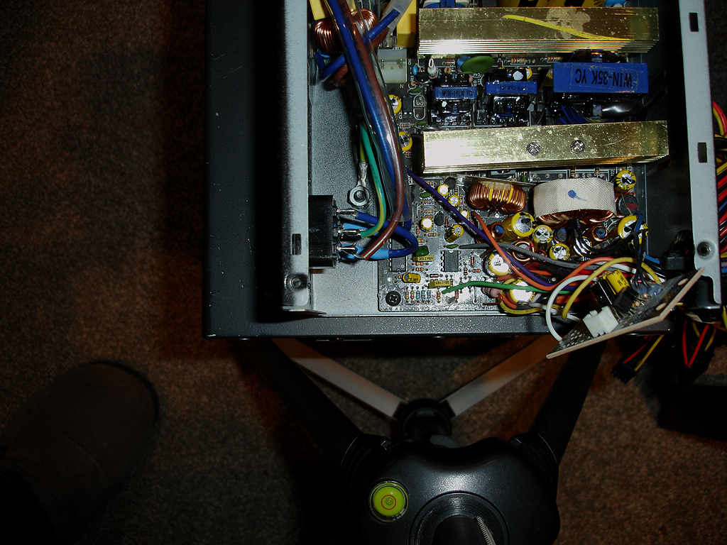 I found one domed cap in the secondary and the PS-ON green wire looks to be damaged by arcing where it enters the PCB.