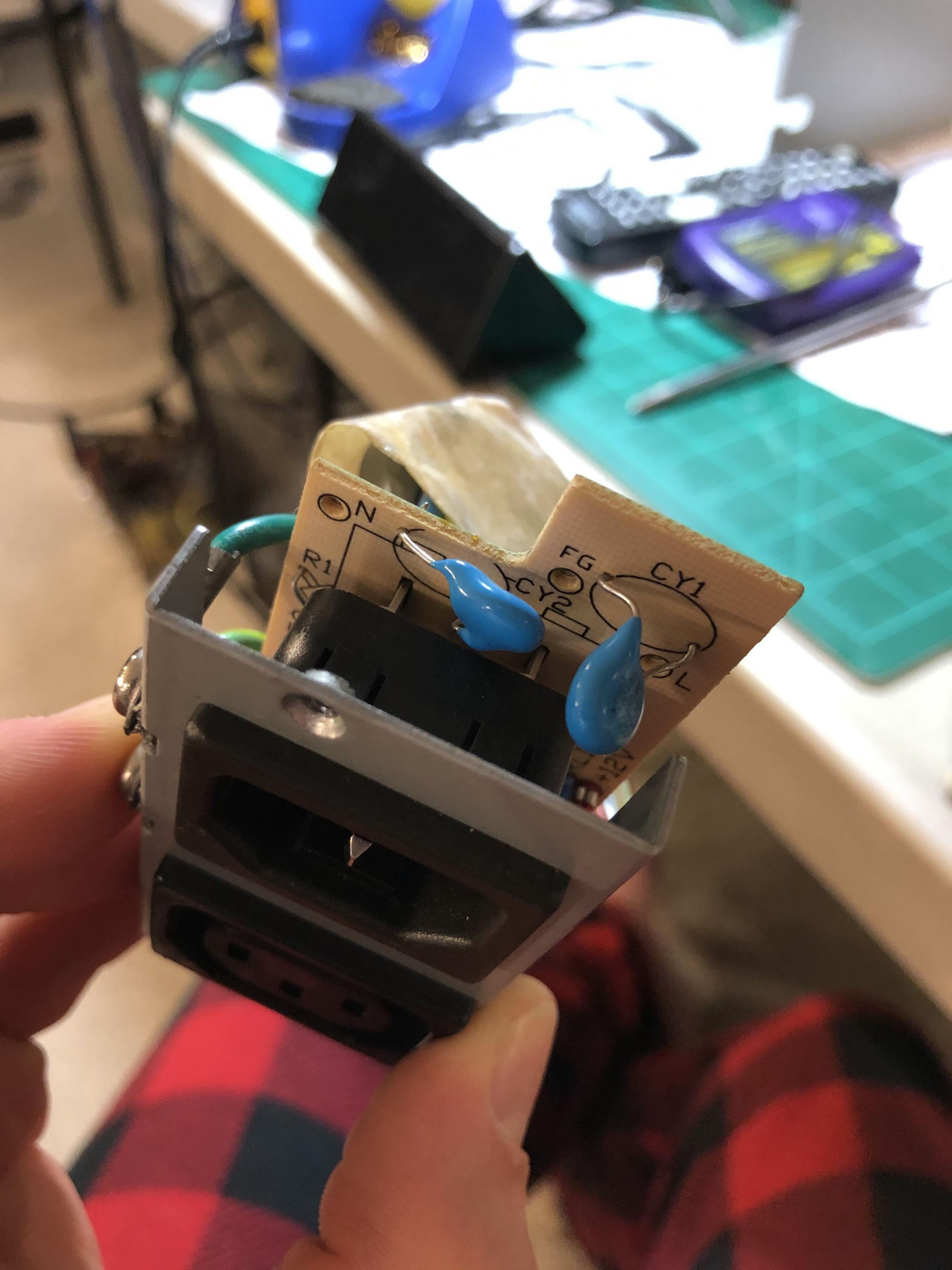 There are a number of ceramics and what look like thermistors in the input section. There is also a board with transistors, etc. on them that is tied into the circuit. The input from the mains is connector J1. The last photo is the actual input board. There are two disc caps on there, they appear to bridge between the hot and neutral to ground, respectively.
