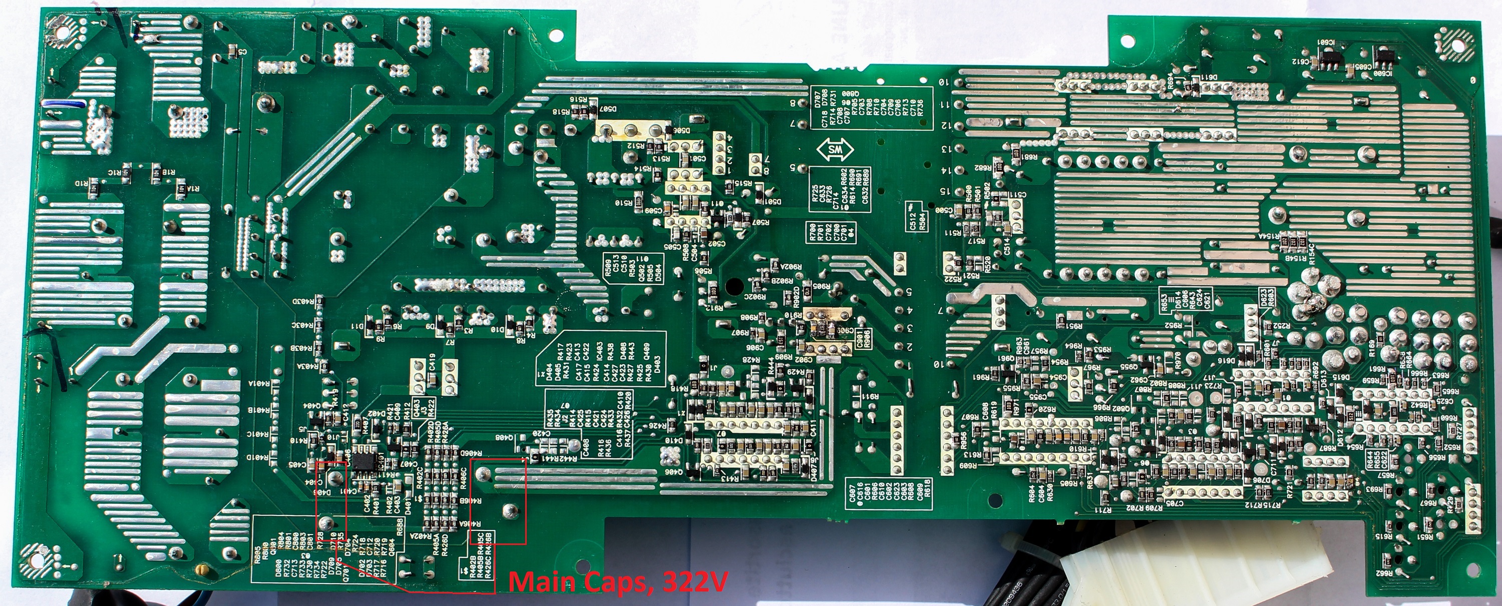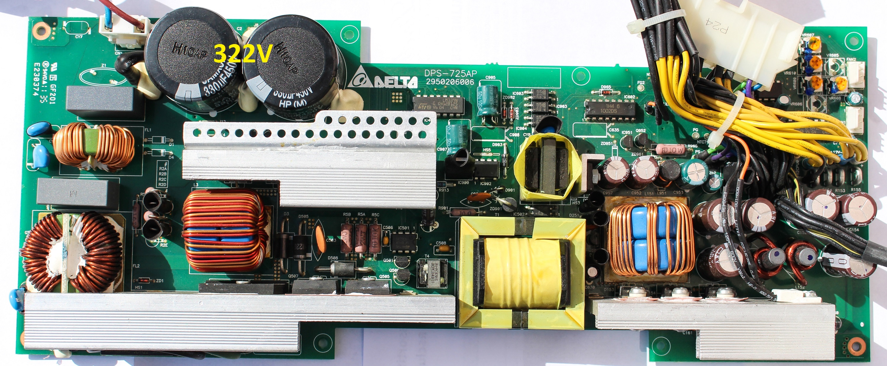 Voltage on the main big caps is about 322V, I marked it on the photos.