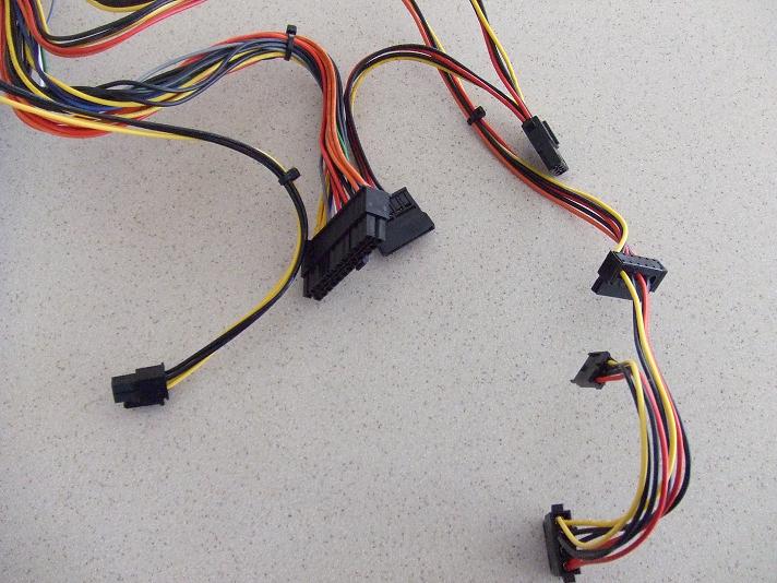 Here are the connectors. Not too many here, a 20+4 pin connector, 4 pin cpu connector, 2 molex, 2 sata (one missing the 3.3v wire,) and a floppy connector. All wires are 20 gauge, with 22 gauge on the floppy connector.